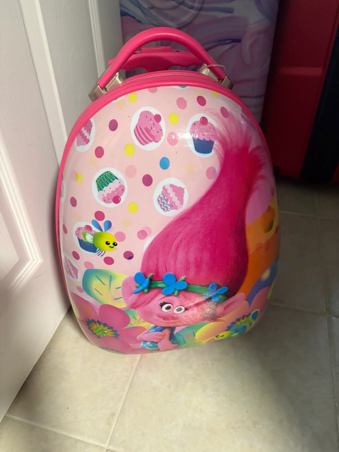 Oval shaped luggage with a handle. Decorated with pink details. Features a Trolls theme. Perfect for keeping your child's belongings safe while traveling.