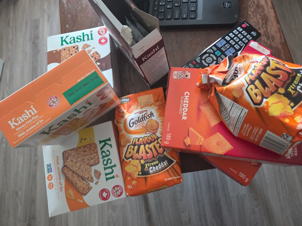 Several boxes and bags of snacks. Some boxes have been opened. You can have them when you are seeking a light distraction. NB They have past best before dates