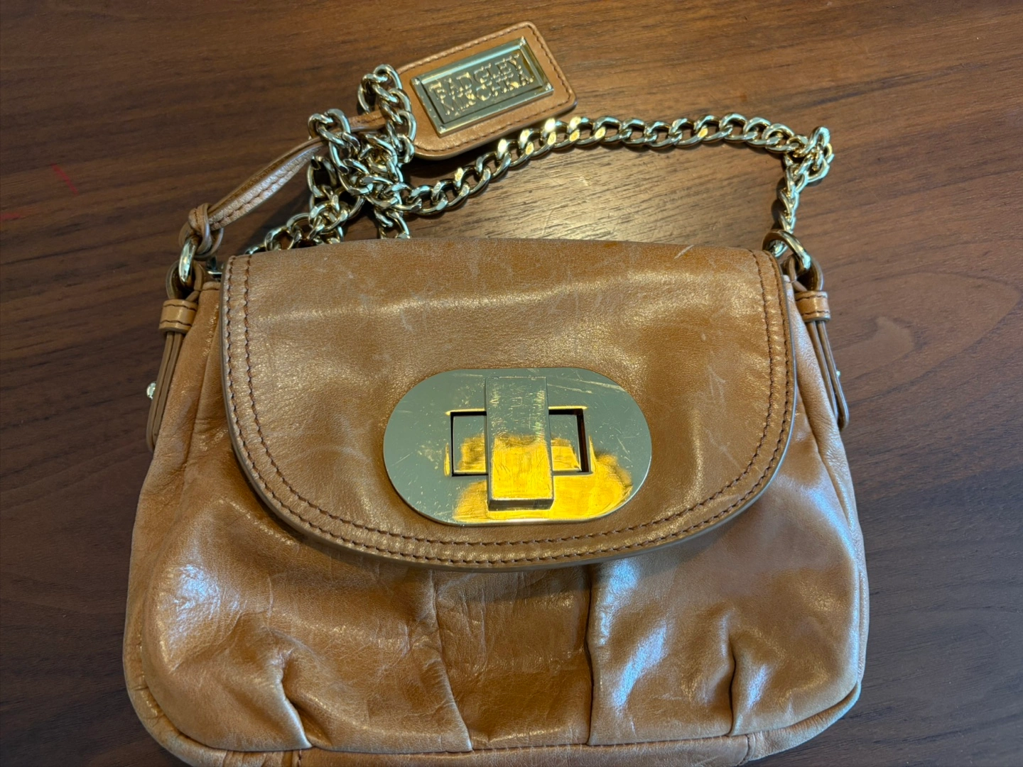 A stylish crossbody bag in brown leather. The bag features a chain strap and a gold-tone clasp. It also has a brand tag hanging from the strap. You can store your wallet and keys inside for a relaxing stroll.