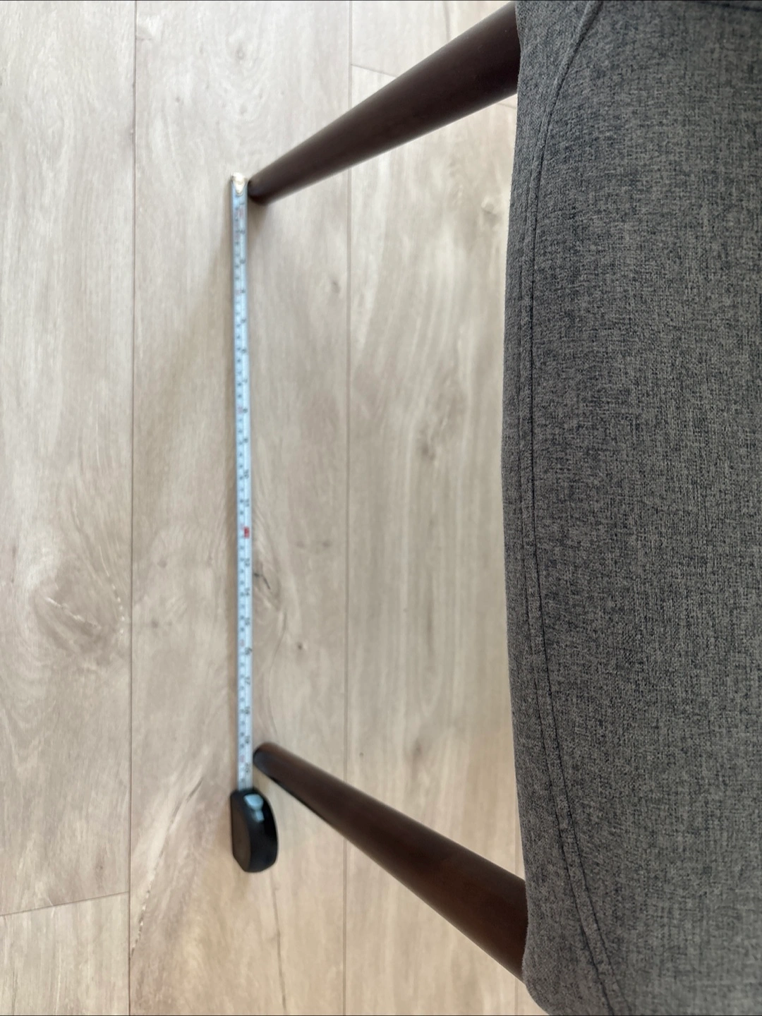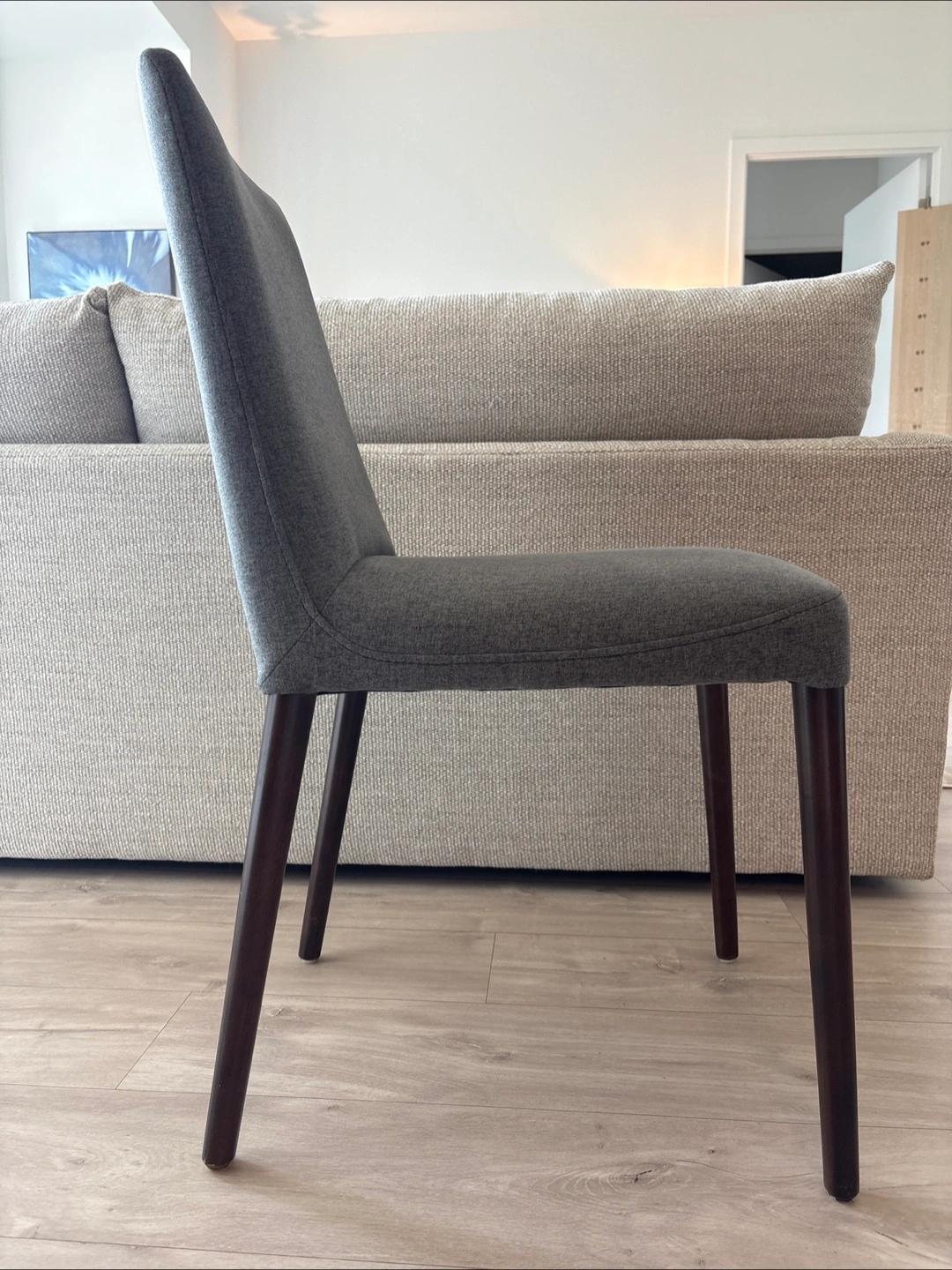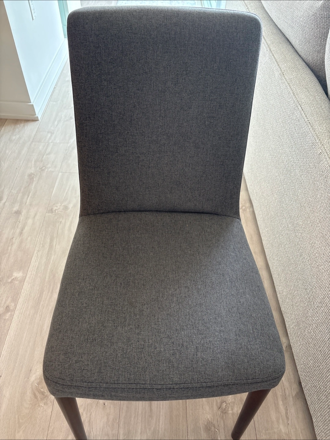 Chair upholstered in a grey fabric. Features dark wooden legs. The chair offers a high backrest. Perfect for dinning. Excellent condition. No smoke home. 5 chairs available but willing to sell only 4 if needed. $50 per chair