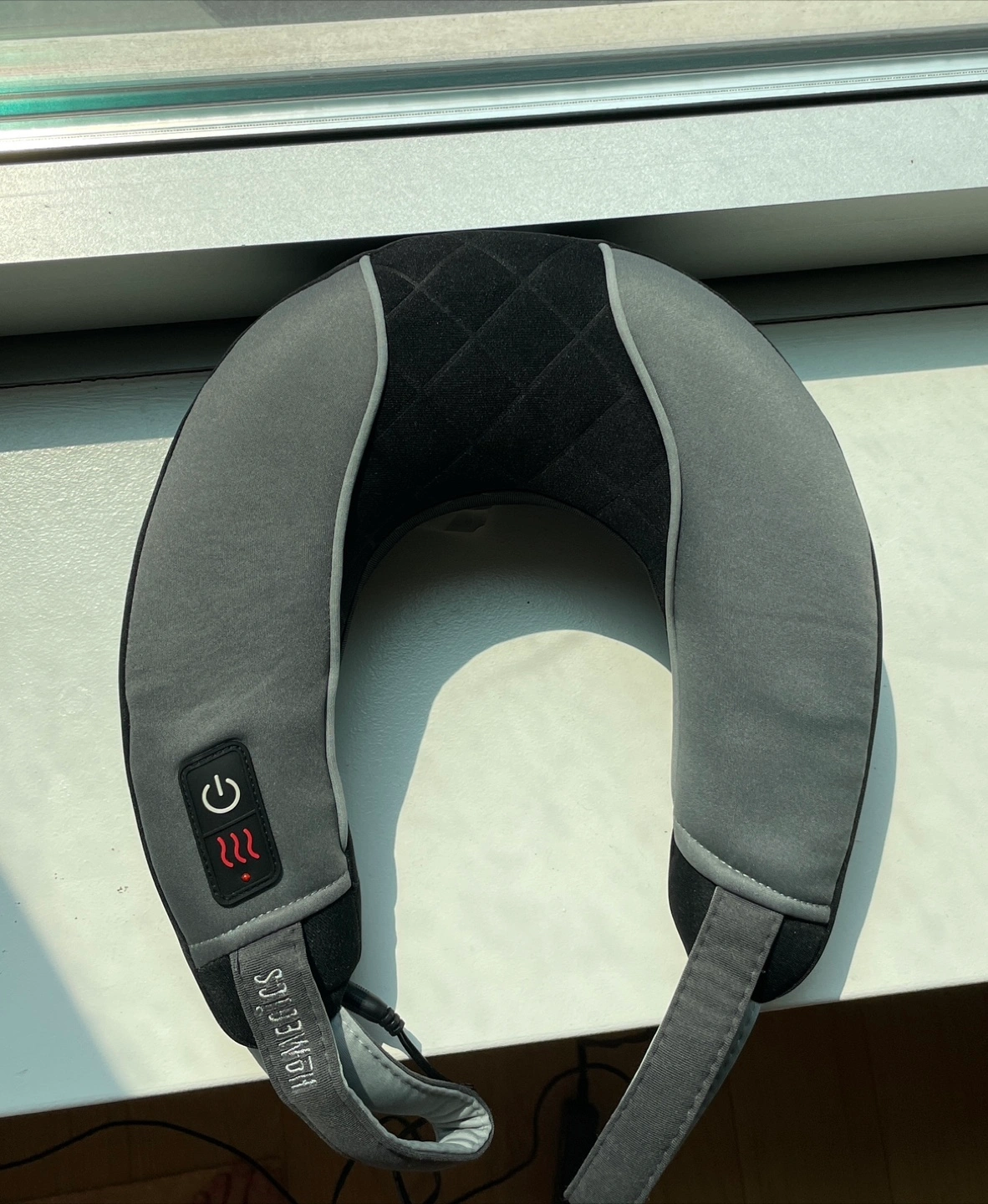 This is a great item for relieving tension after a long day. The massager is gray and black. It has a power button with heat option. The fabric is soft and plush. The item was gently used.