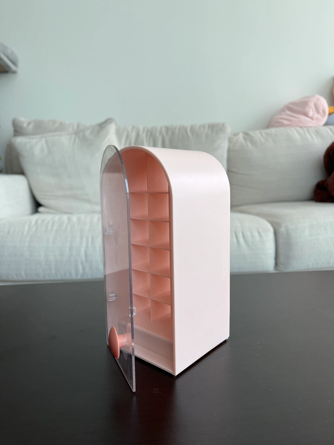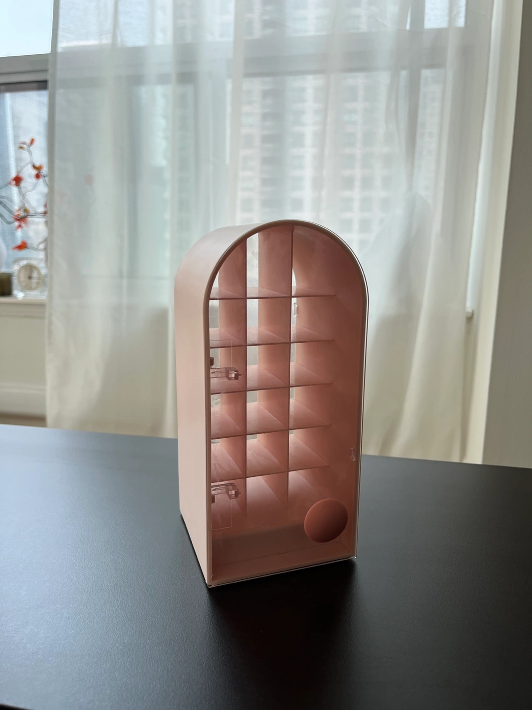 Pink display case in a cute arch design with swivel door.