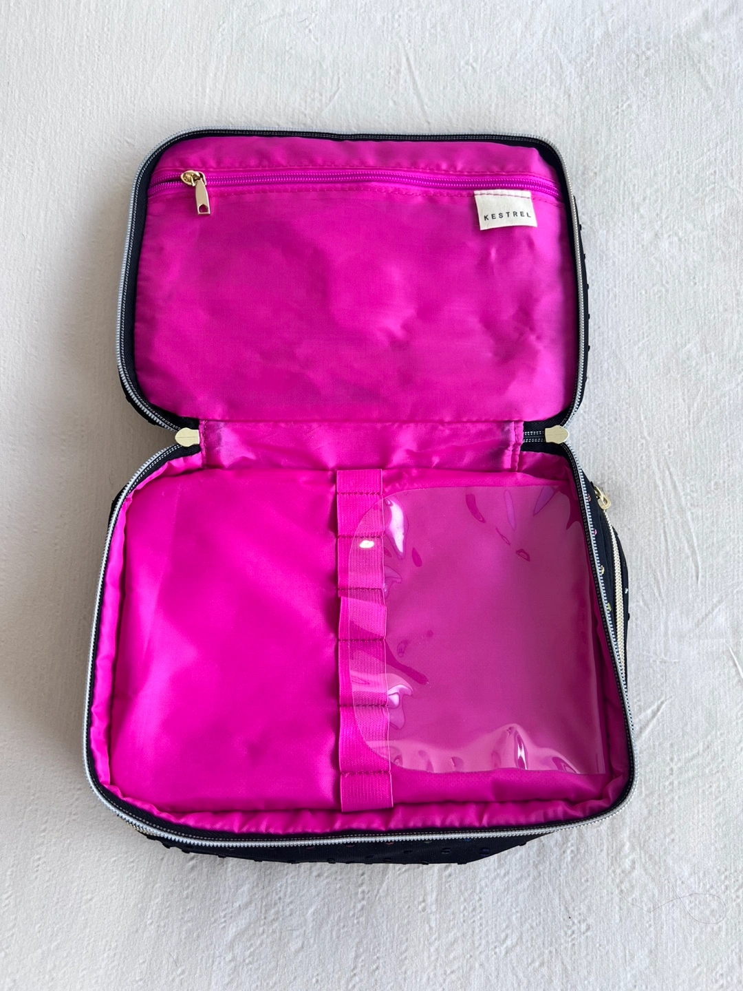 It has a zippered closure with gold-tone hardware. The interior is a vibrant pink, with a clear compartment.