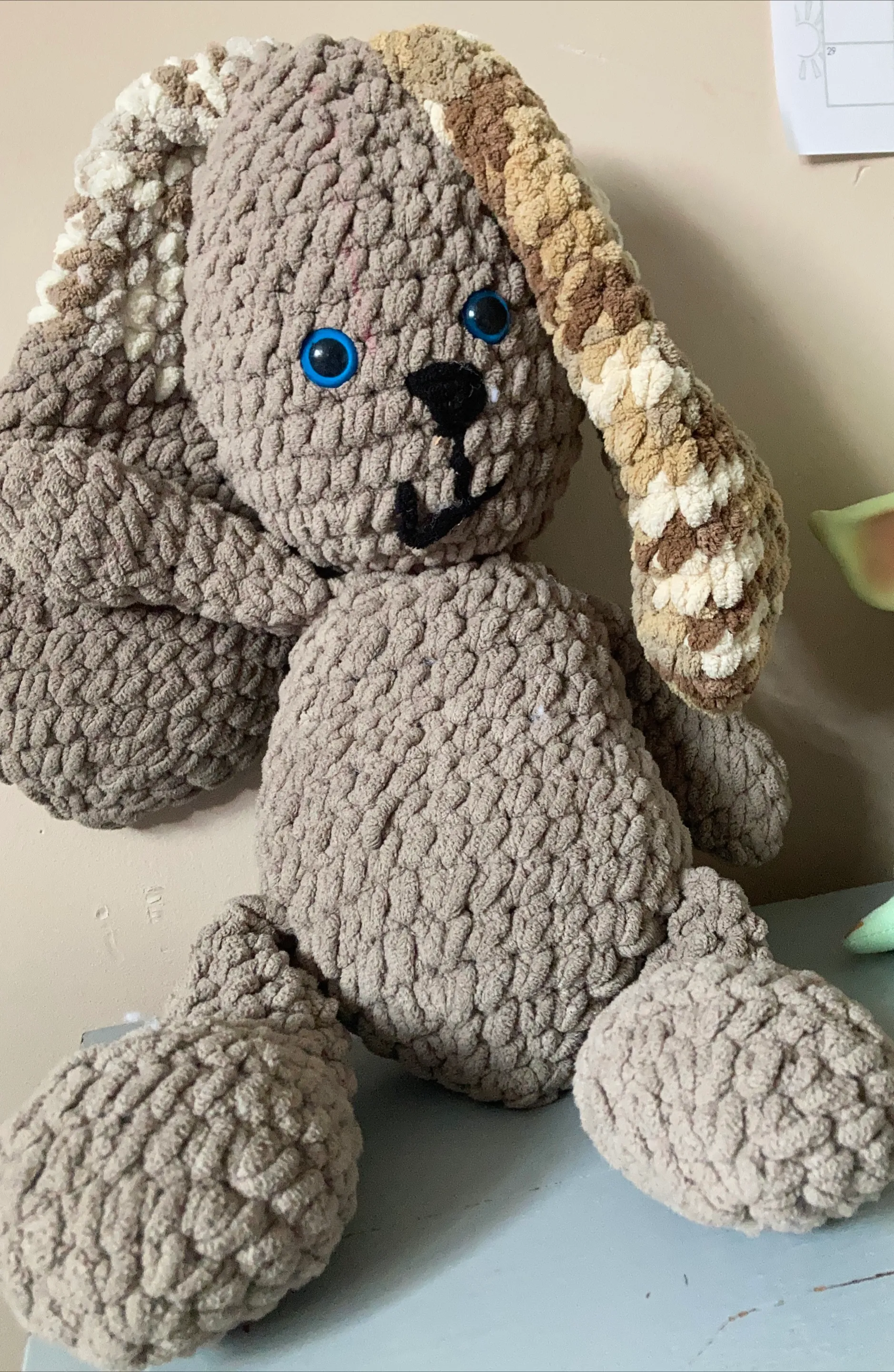 Crochet bunny. It has big blue eyes. Constructed with soft yarn. Its colour is light brown. Cuddle this bunny for the ultimate sense of comfort.