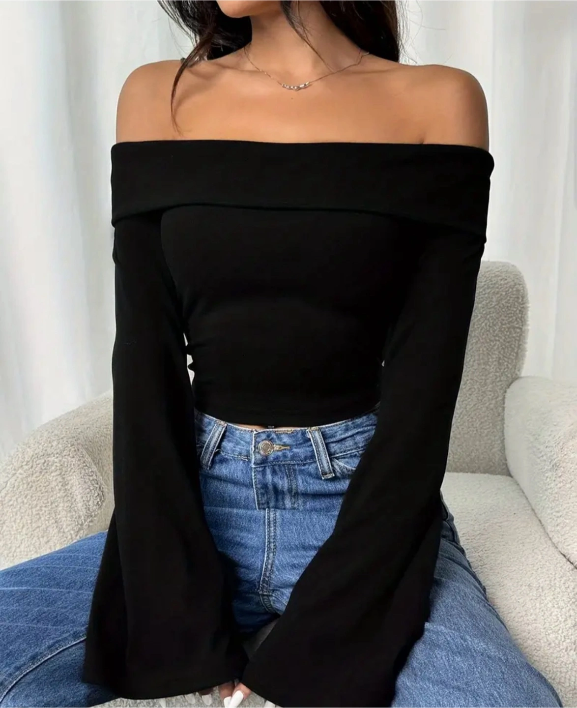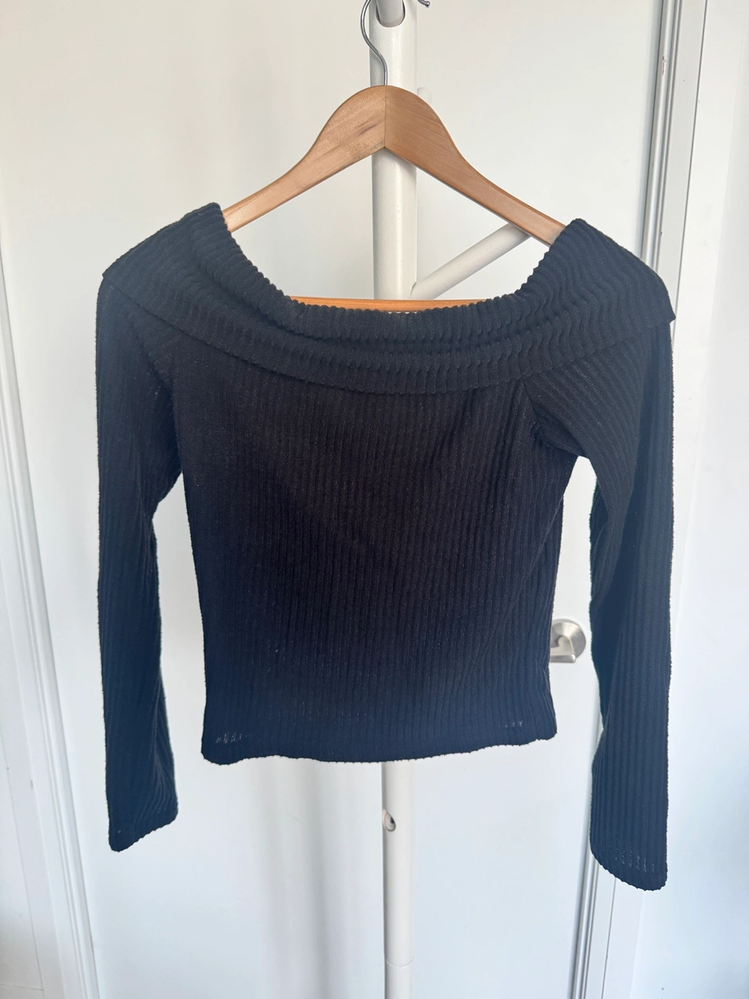 Black top. Features long sleeves. Off-the-shoulder style. Never use