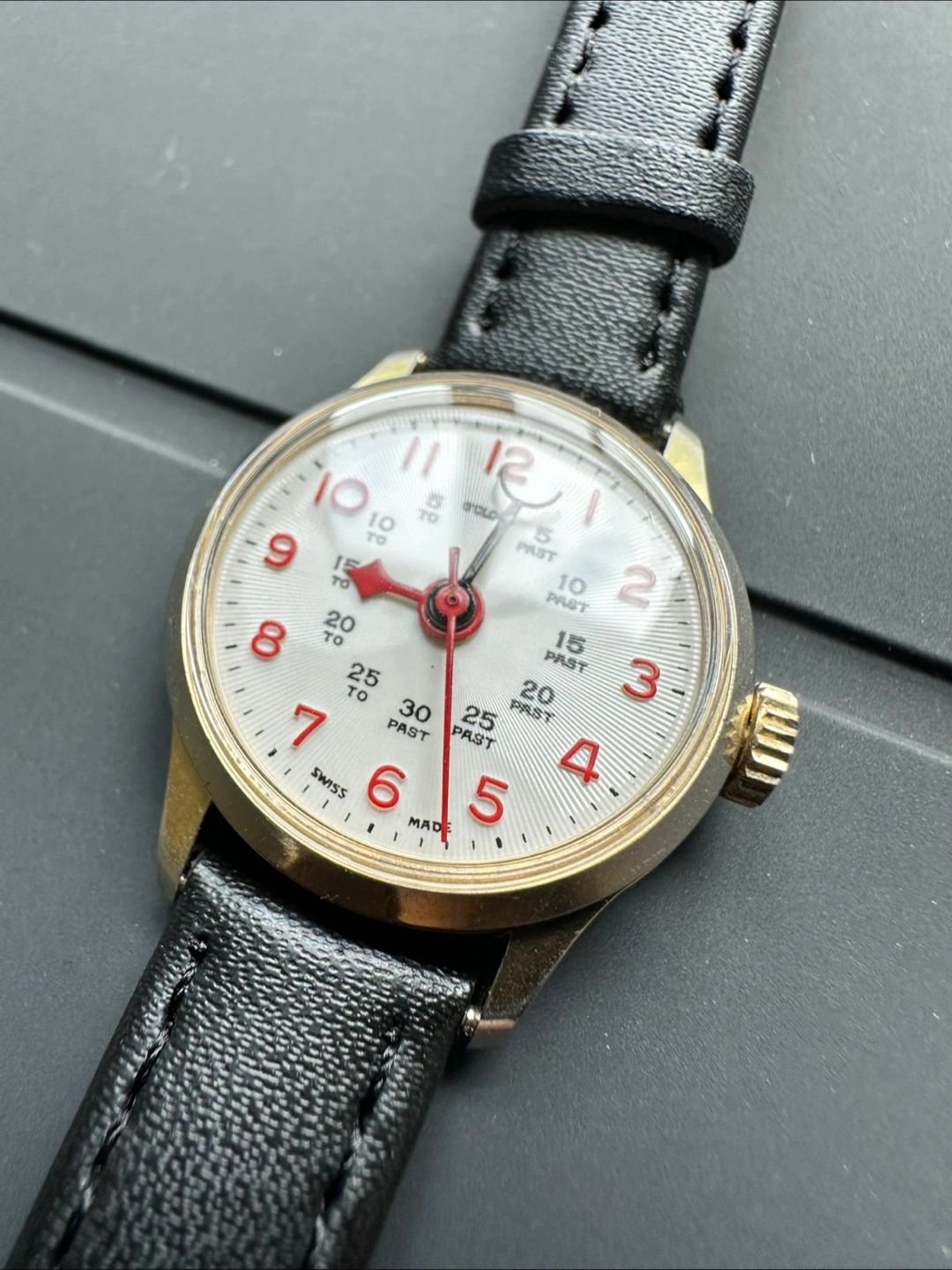 Textured white sunburst dial with red diamond and black half moon pointer style hands, and red painted numerals.