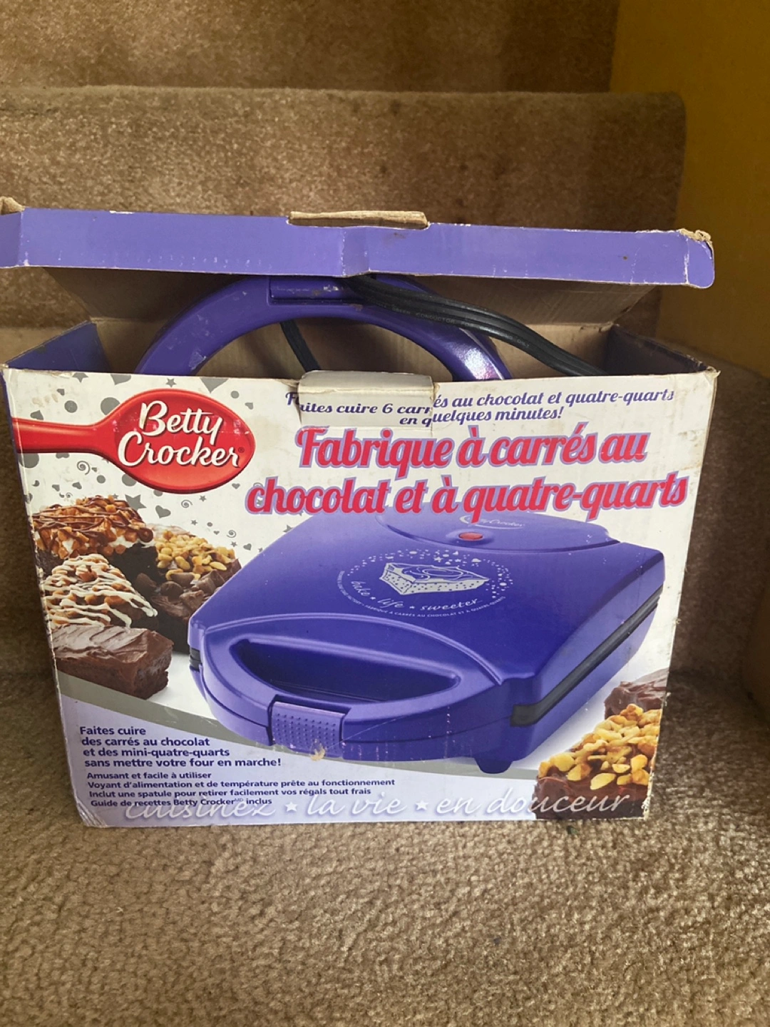 A brownie maker in good condition, perfect for a cozy day of baking. Features a purple exterior and a handle for easy transport.
