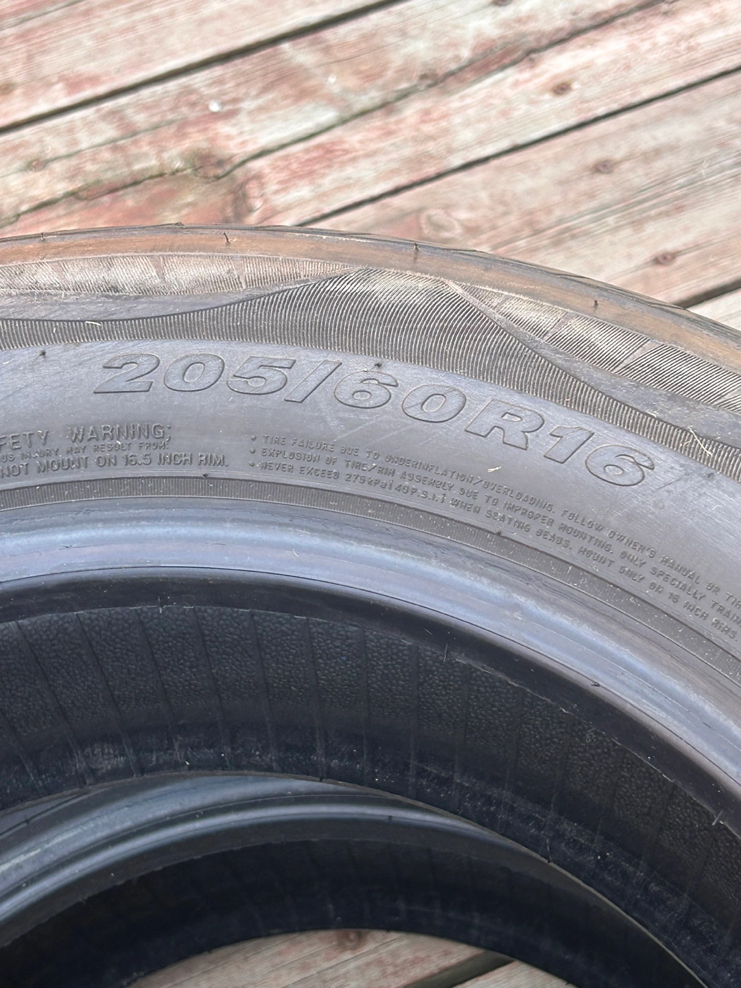 2 Tires shown stacked, appear to be in great shape. They are tires with a black rubber surface. They have a detailed tread design. They would be excellent for your car. Selling both tires for $100 or obo.