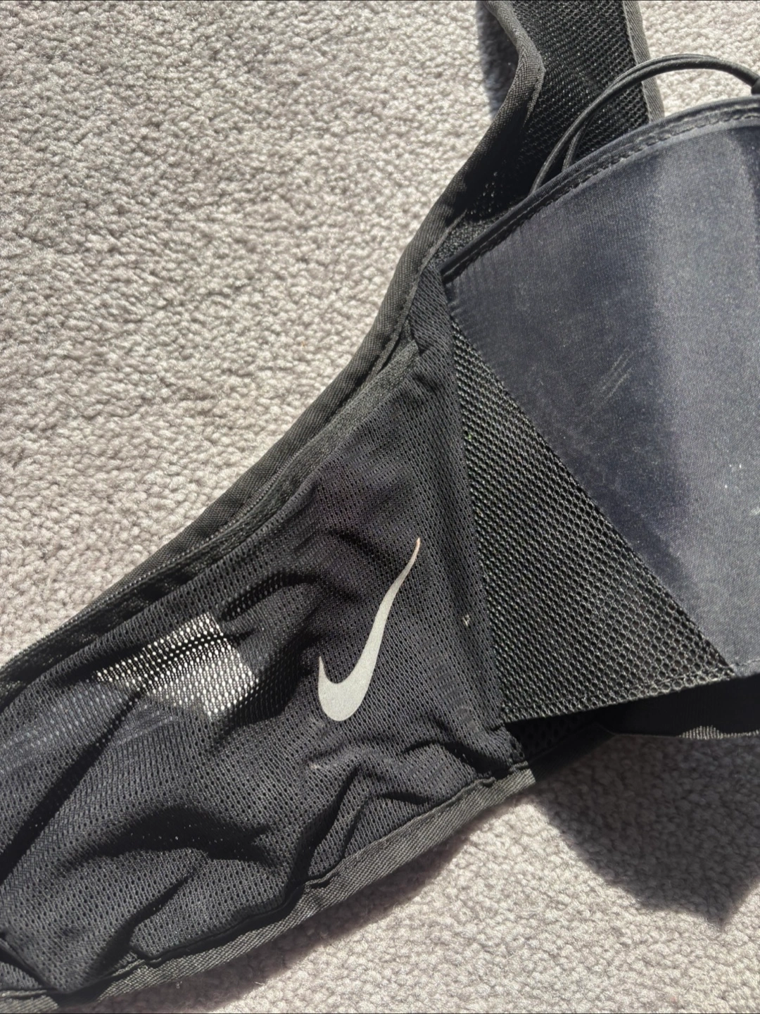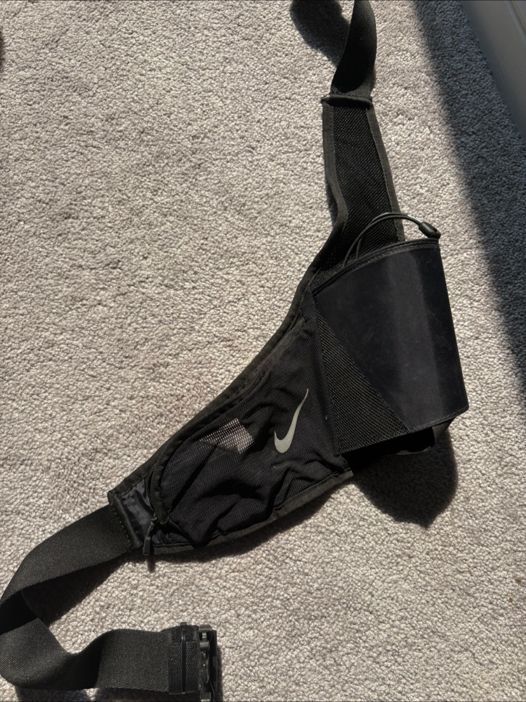 A black running waist bag. Features a zip pocket and mesh pocket. Adjustable strap and buckle. A great way to relax during your workout session.