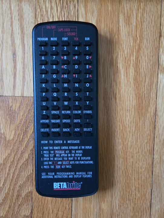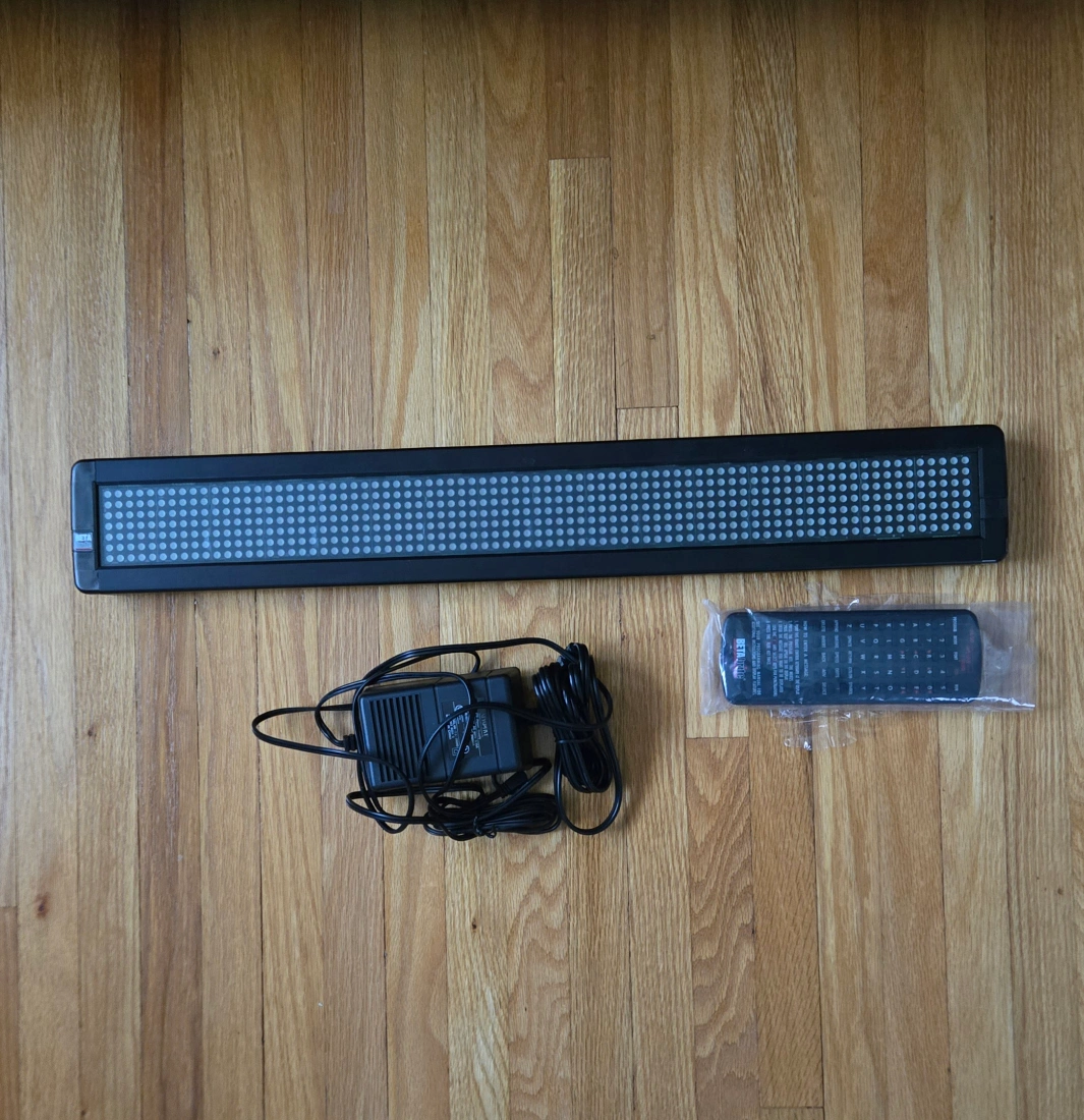 Rectangular black LED display, with a power adapter and remote. Great for displaying customized messages for a variety of uses.