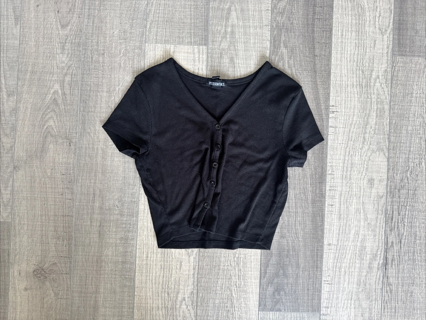 A black short sleeve top with a button-up closure. V-neckline with a ribbed texture. A very versatile piece you can match with anything, perfect for layering.