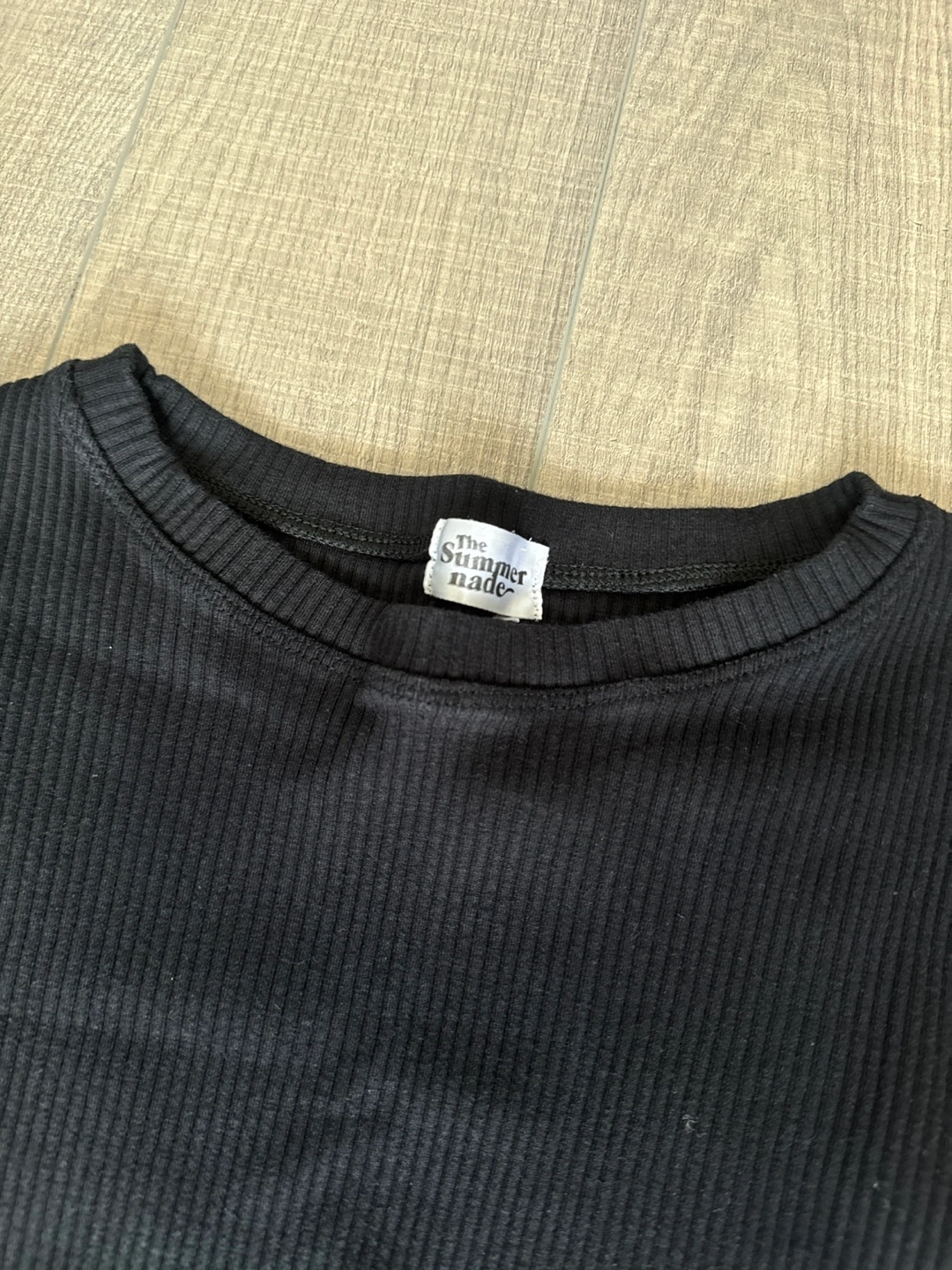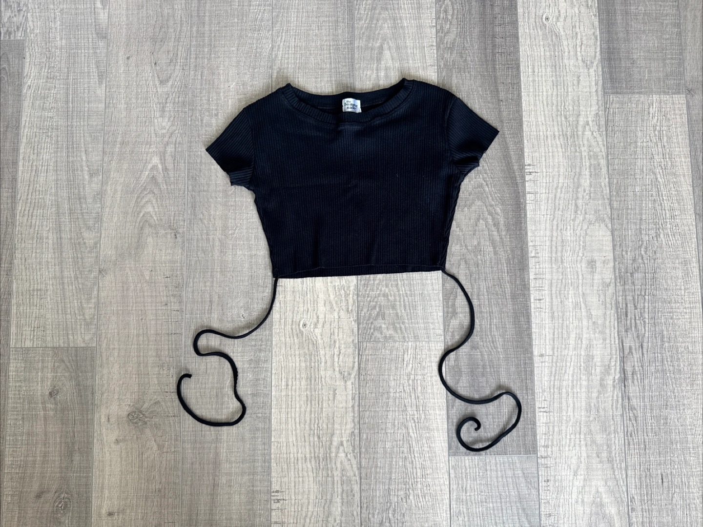A black crop top. Features a ribbed texture. Crew neck. Includes tie-up detailing. Perfect for relaxing on a quiet afternoon.