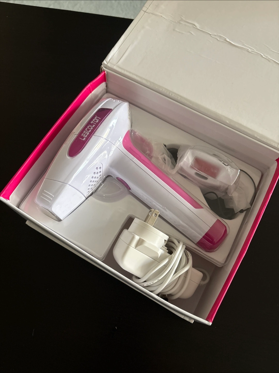The device is white with purple accents. Comes in the original packaging. A great at-home device to help make your life a bit easier.