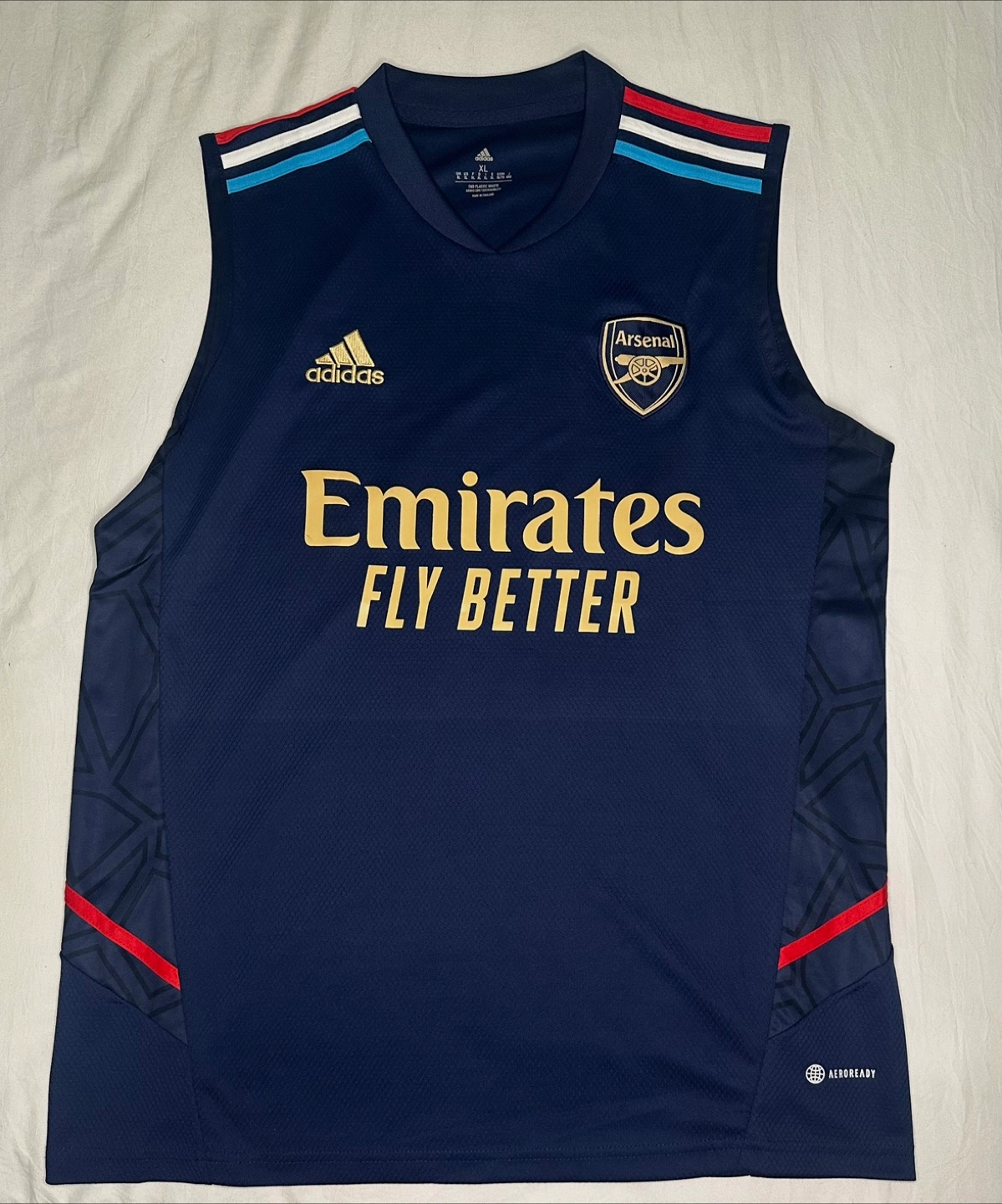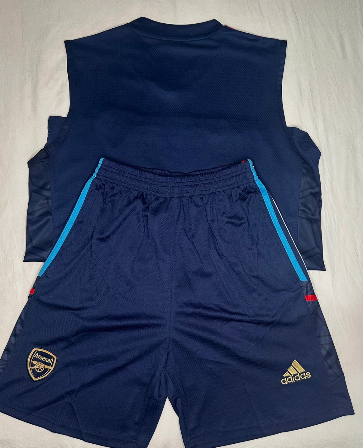 Navy sleeveless top with matching shorts. Gold accents. Team logo on both pieces. Perfect for a relaxing workout.