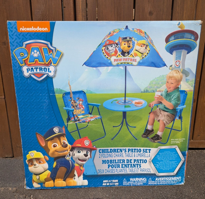 A Paw Patrol themed patio set. Includes two chairs, a table, and an umbrella. Perfect for your child to have a pleasant and relaxing time outdoors.