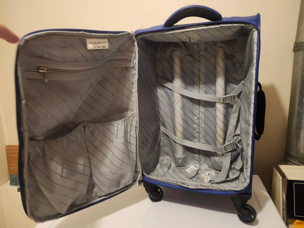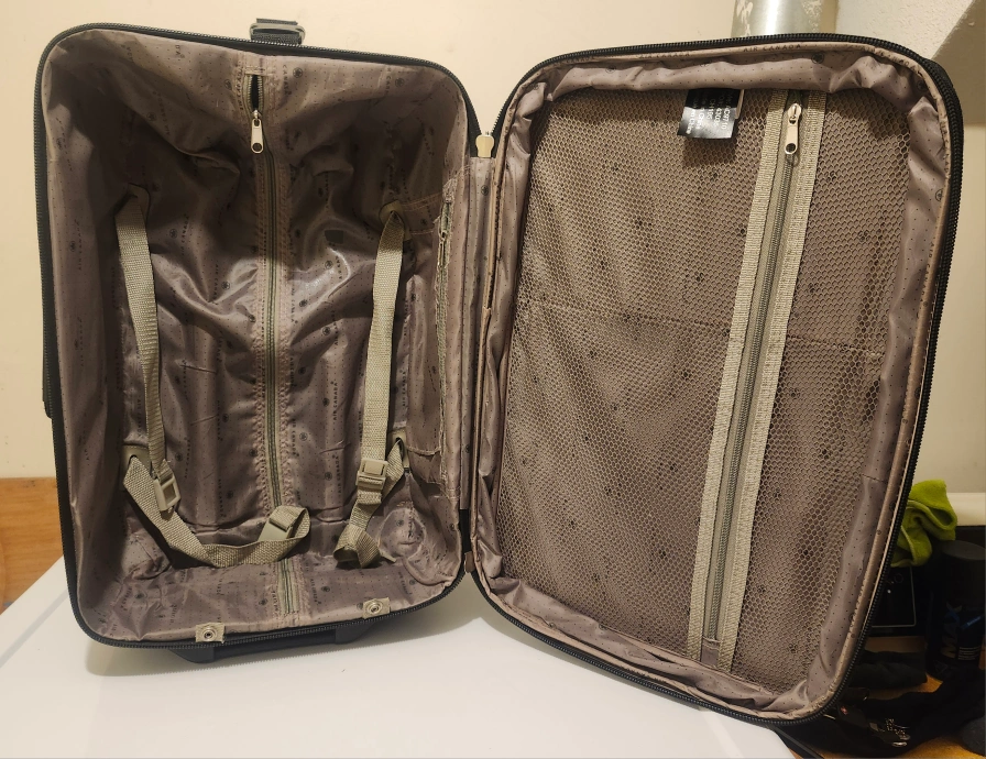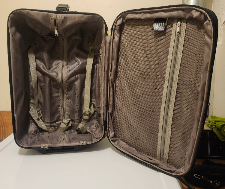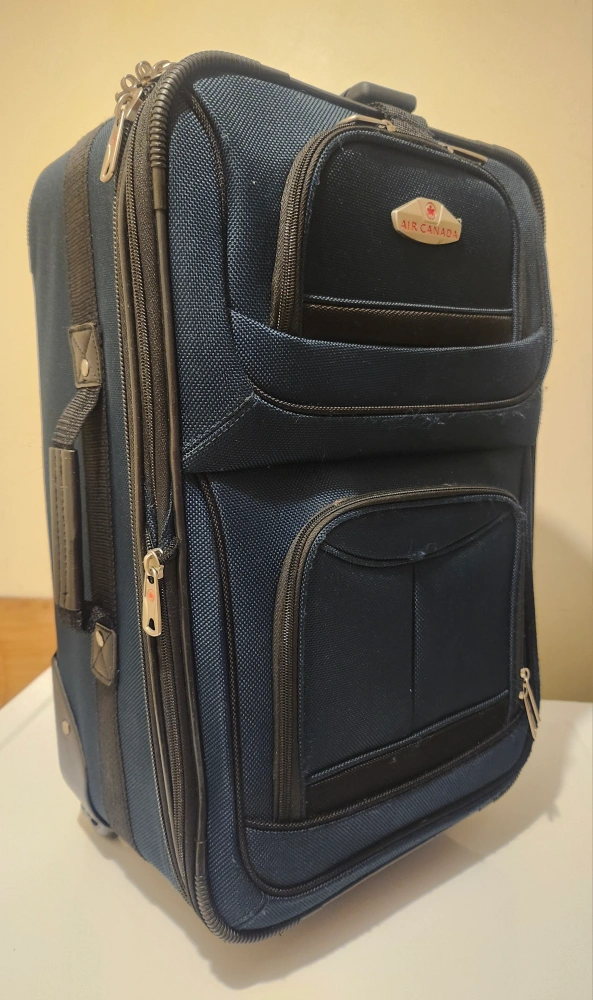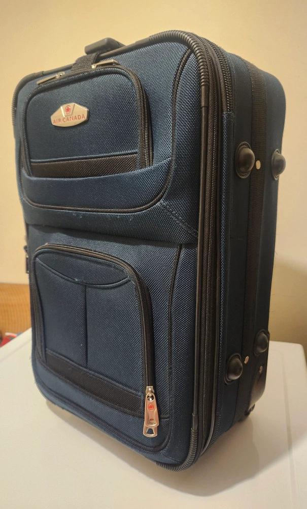 Rolling suitcase with two compartments. The inside is lined, with straps and mesh pockets. Exterior with pockets and zippers. A great item for any kind of travel. 13" inches wide X 19" inches length and 8" inches depth. it's a hand carry on luggage size. Price is firm. Meet @ 29th Skytrain Station for pick up.