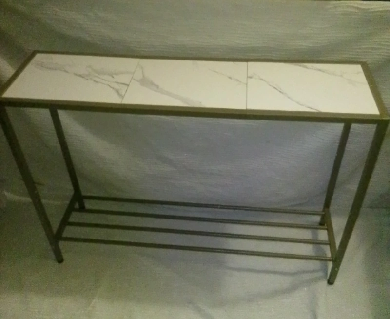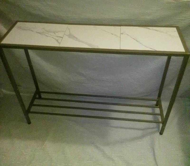 Metal frame table. White marbled pattern top. Shelf for storage. A beautiful piece to help organize your home.