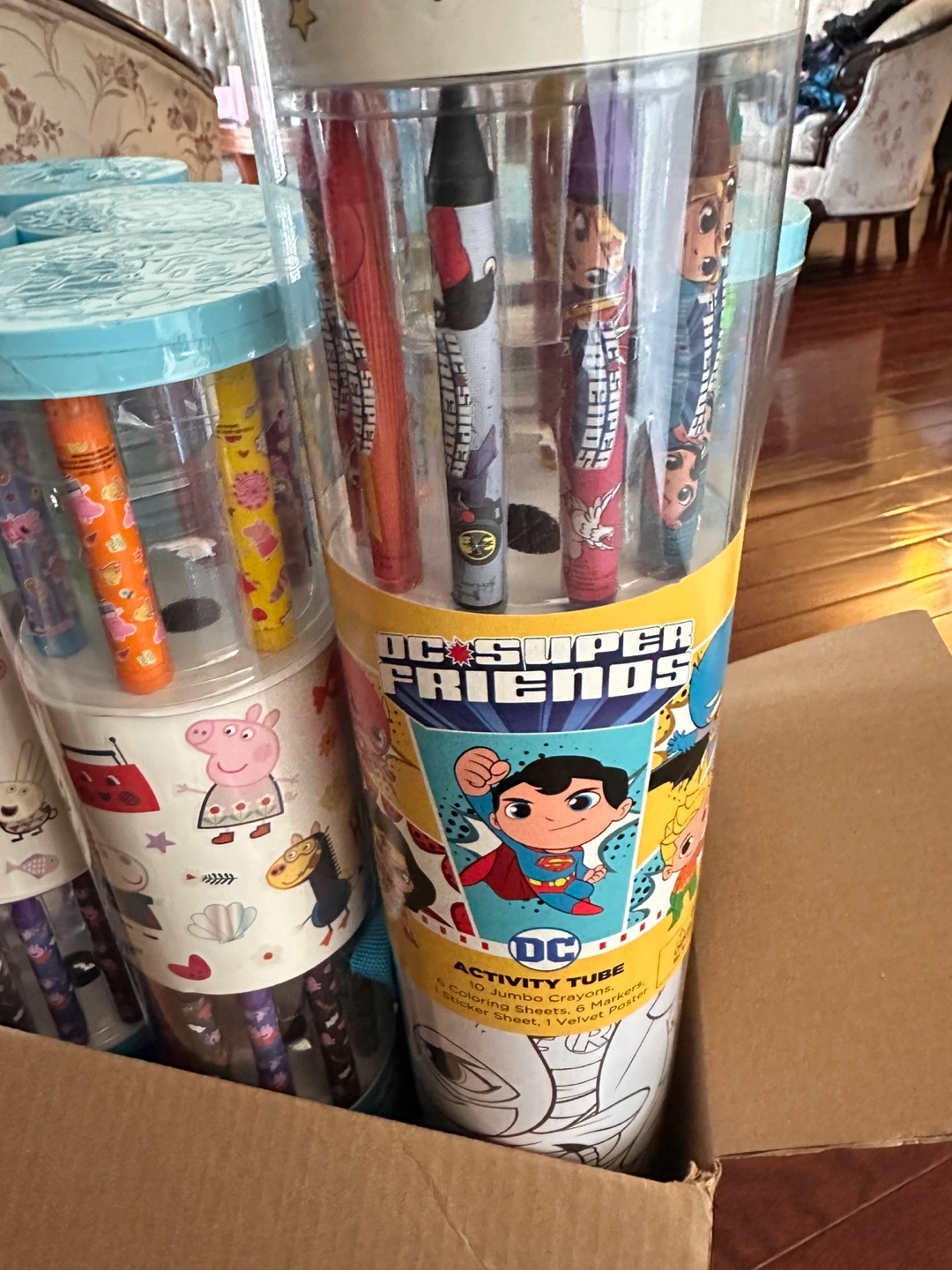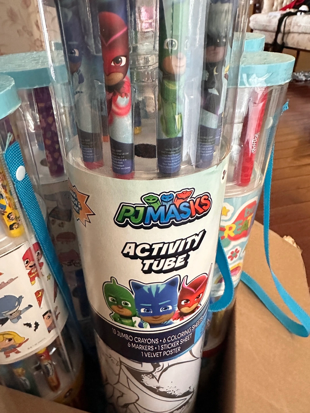 A collection of activity tubes filled with crayons, markers and stickers. Each tube features a different character. Something fun for anyone, perfect for some relaxing time.