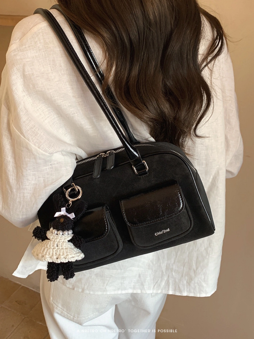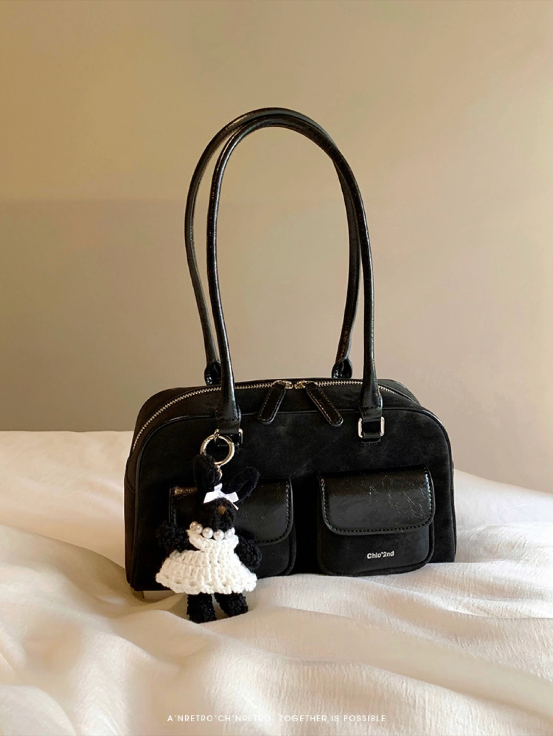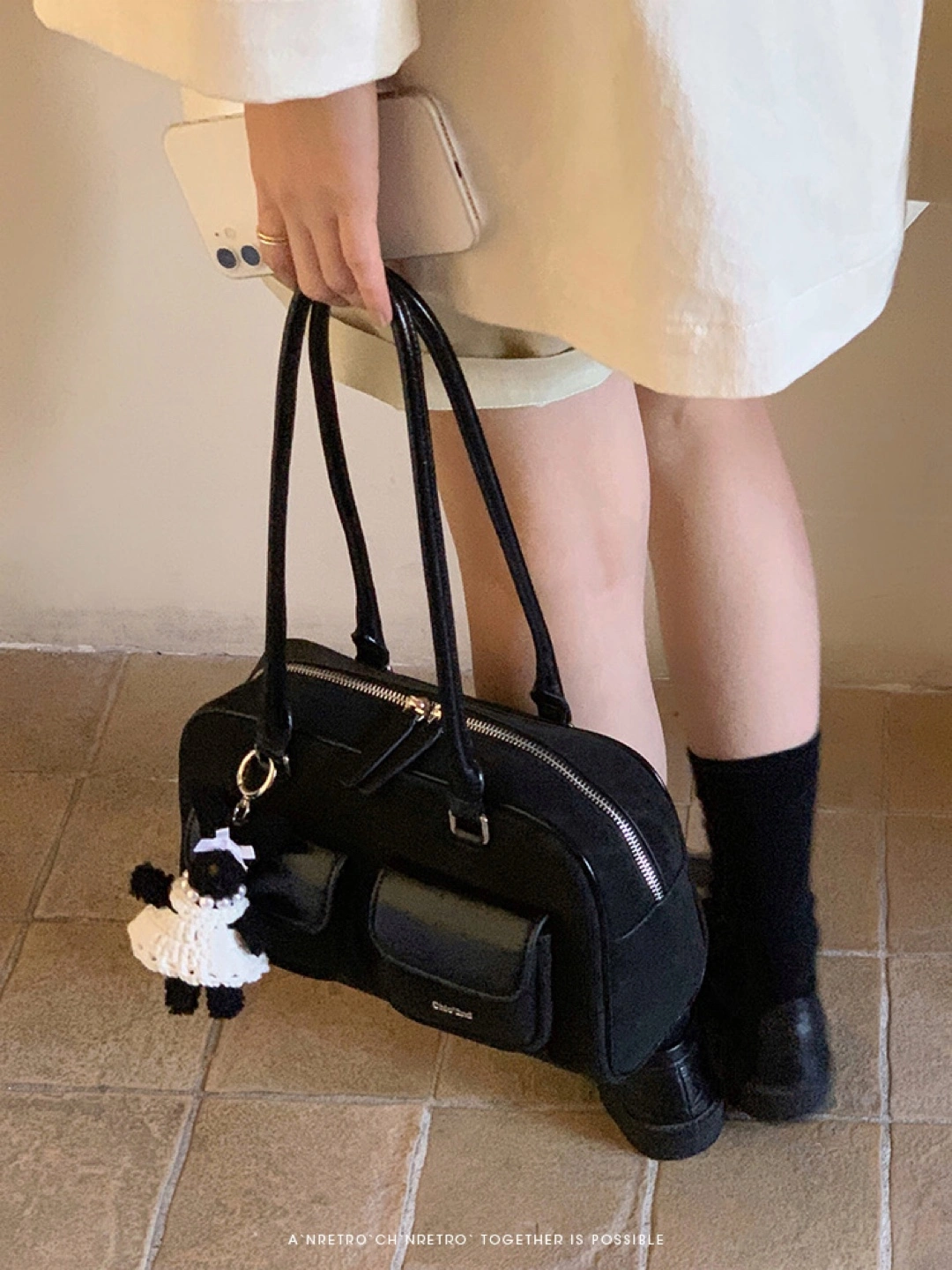 Beautiful black bag. Comes with two small pockets on the front. A lovely pearl necklace decorates the neck of the rabbit charm. A great bag for a leisurely walk in the park.