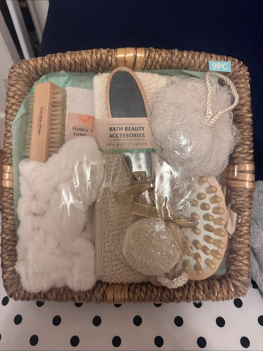 Included is a woven basket with many bath accessories inside. There are multiple tools for exfoliation and relaxation. A great way to enjoy some self-care time.