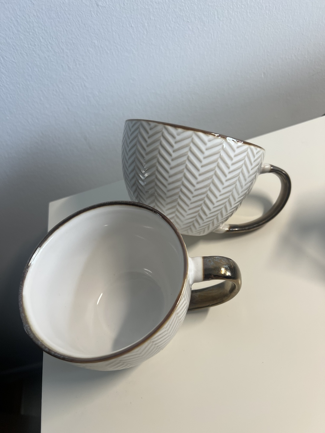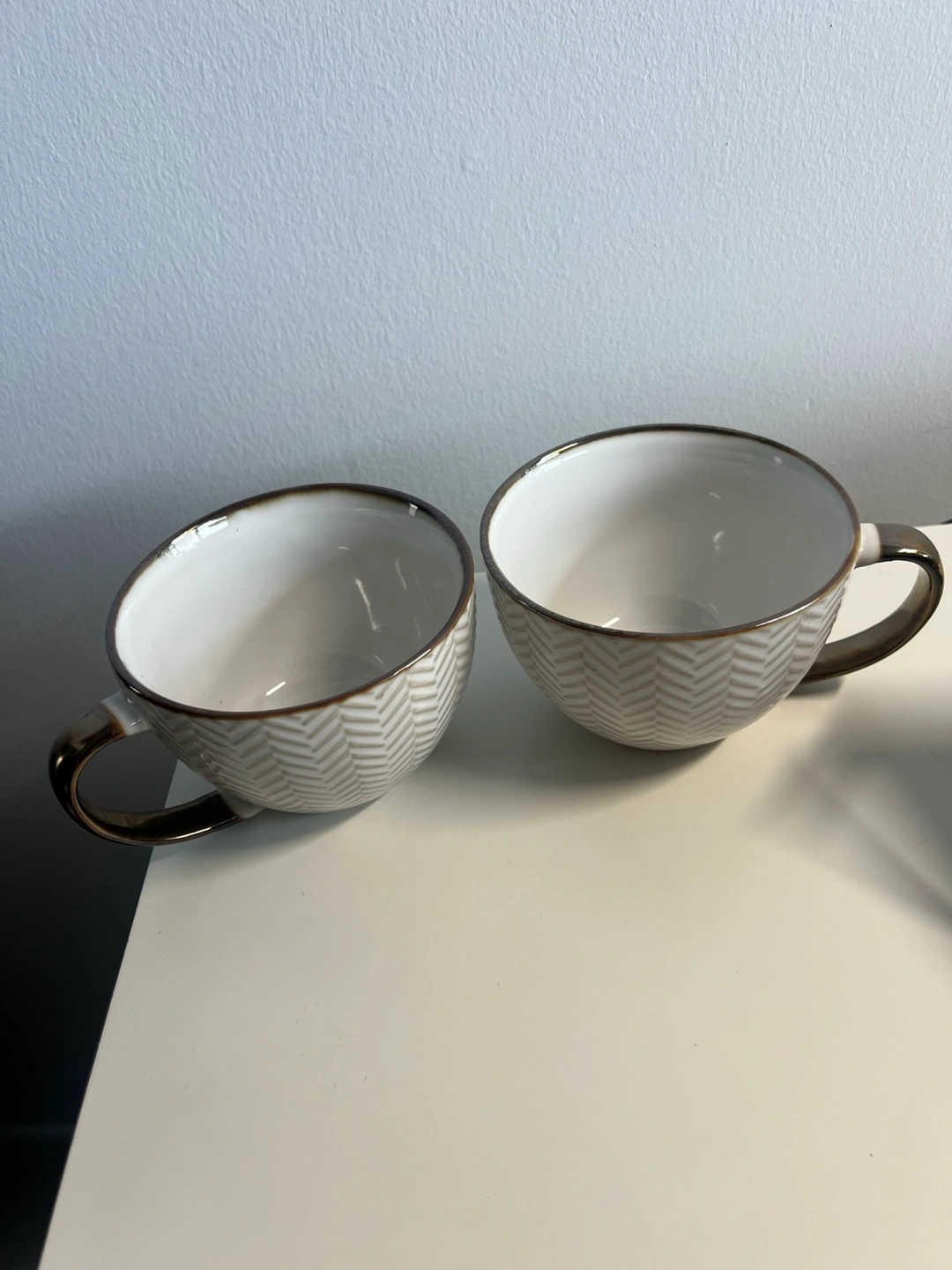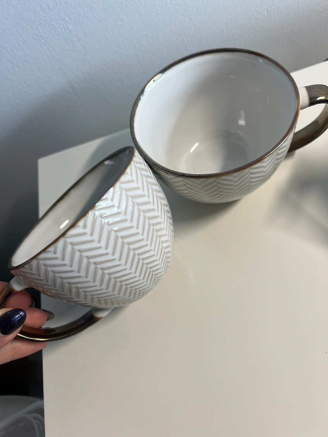 A set of two large white cups. Featuring a subtle, herringbone-like pattern. Cups have gold trim on the handles and rims. Perfect for a hot beverage on a cool evening.