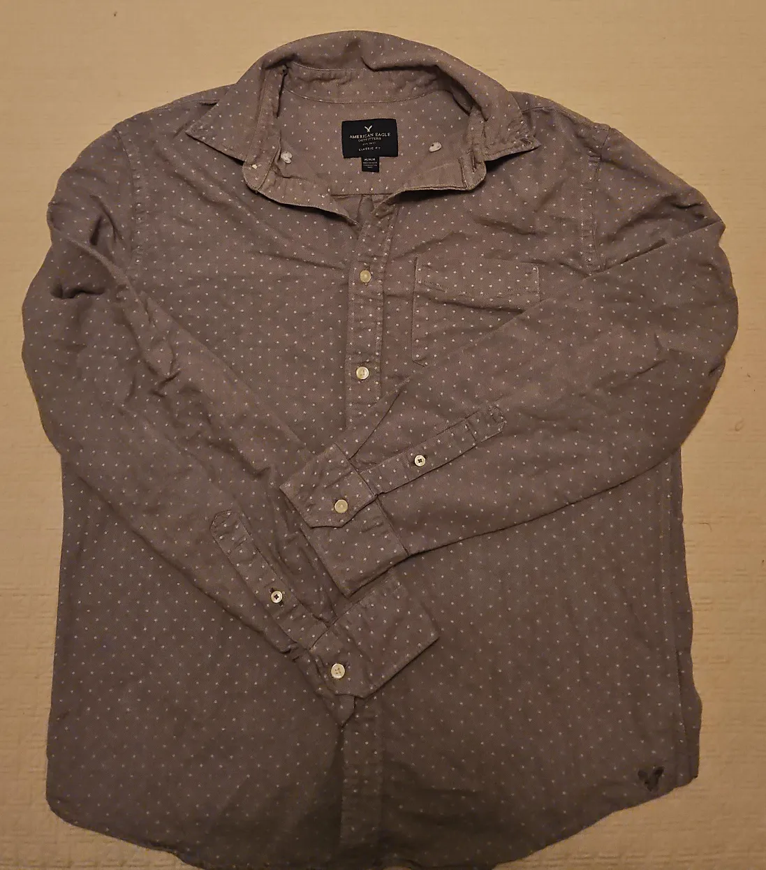 A button-up collared shirt. Long sleeves with buttoned cuffs. Features a small all-over dot pattern. Consider wearing this shirt when spending a calm evening in, watching your favourite movie. Check out my many other listings by clicking on my name!