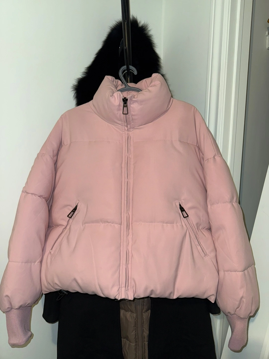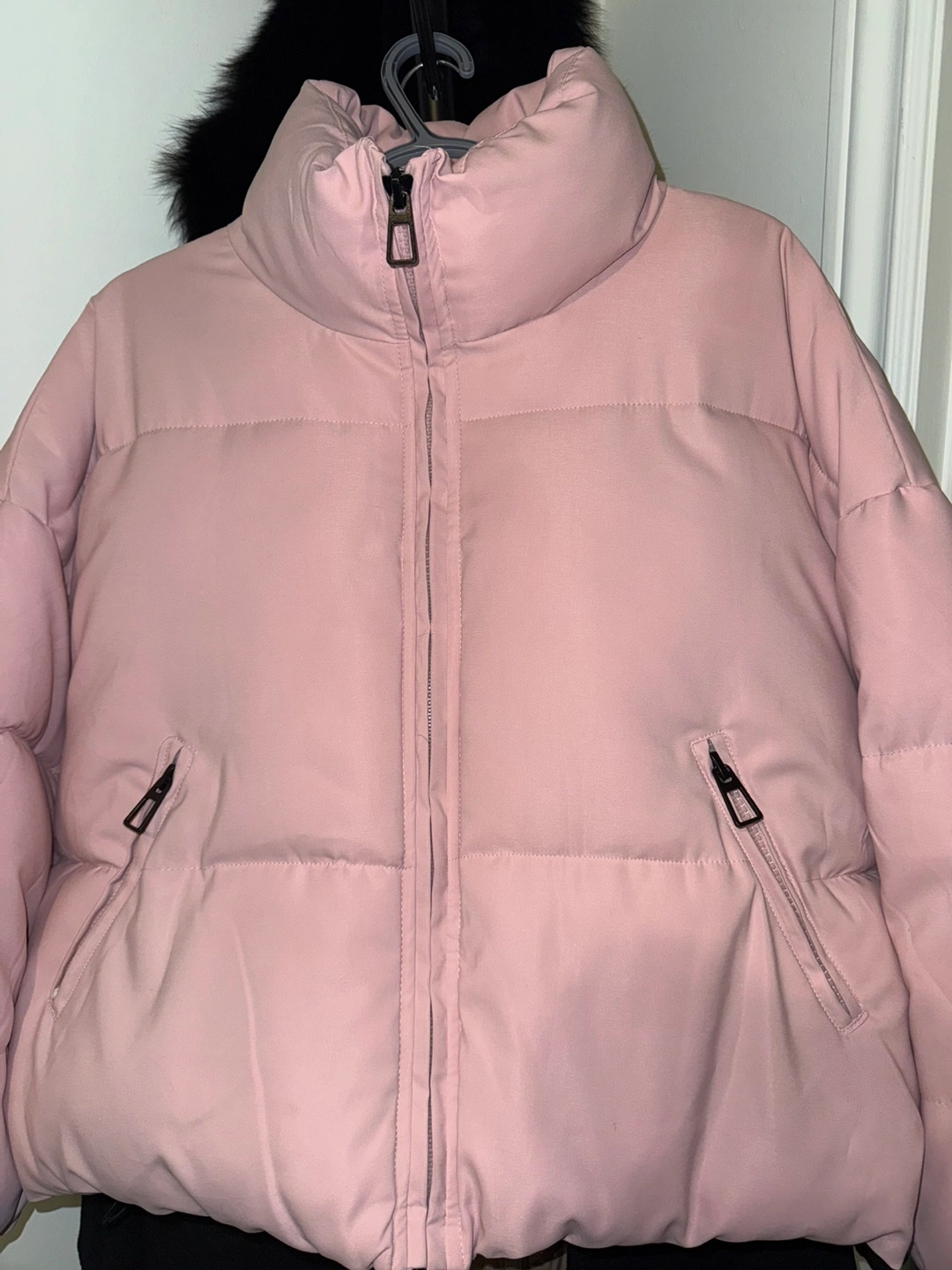 261A light pink puffer jacket. Featuring a high collar and a zipper closure. Including two side pockets. This jacket is perfect to cozy up in on those cold days.