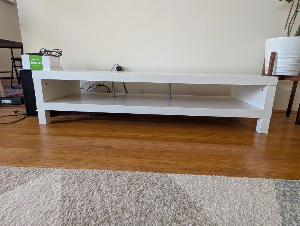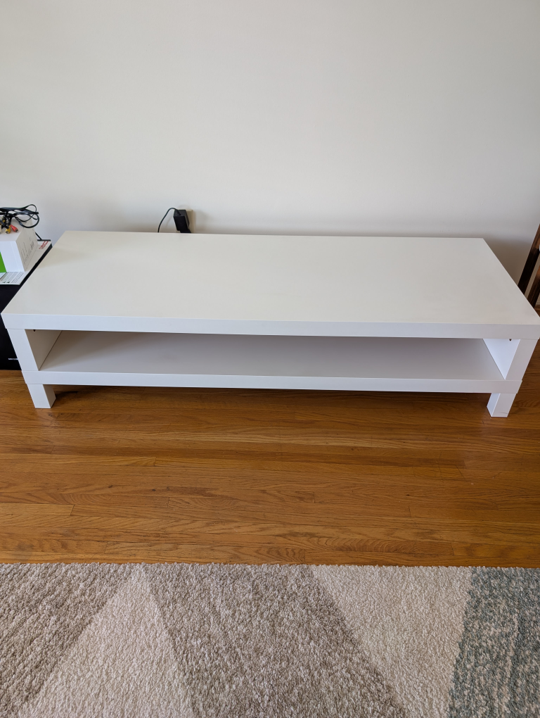 A white rectangular TV stand. Features a bottom shelf. Perfect for keeping a tidy and peaceful living room. From a non-smoking, non-pet owning household.