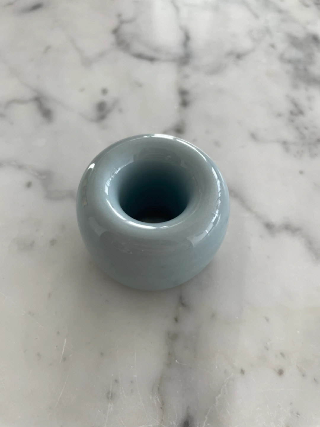 A small, pale blue ceramic bud vase. Features a smooth, glossy finish. Could easily bring a sense of calm into a space, adding a bit of life and elegance.