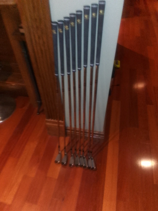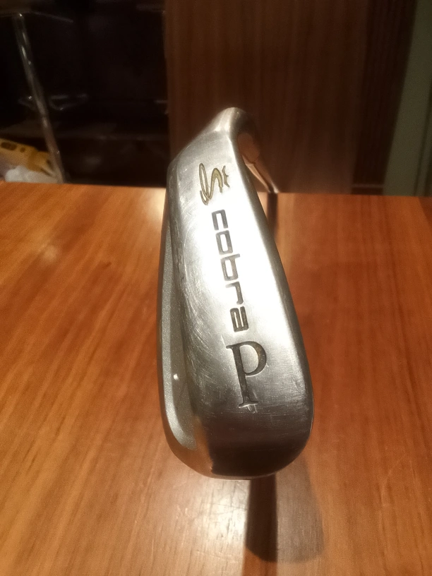 A set of golf clubs (Cobra Iron set #3-P), some with grips that have a gold emblem. Metal shafts with rubber grips. A set to elevate your game, or a great starter set.