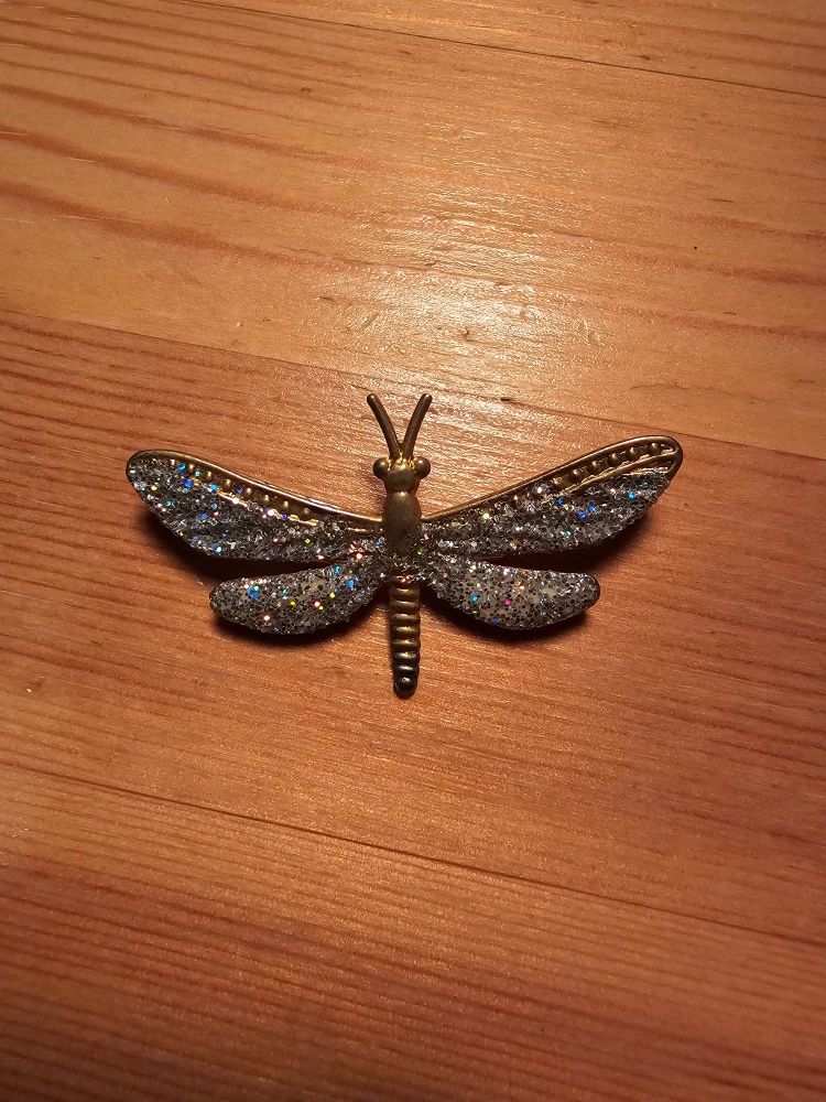Dragonfly brooch with glittered wings from late 90s/early 2000s! Gold-toned metal and pin back closure. Super great condition!