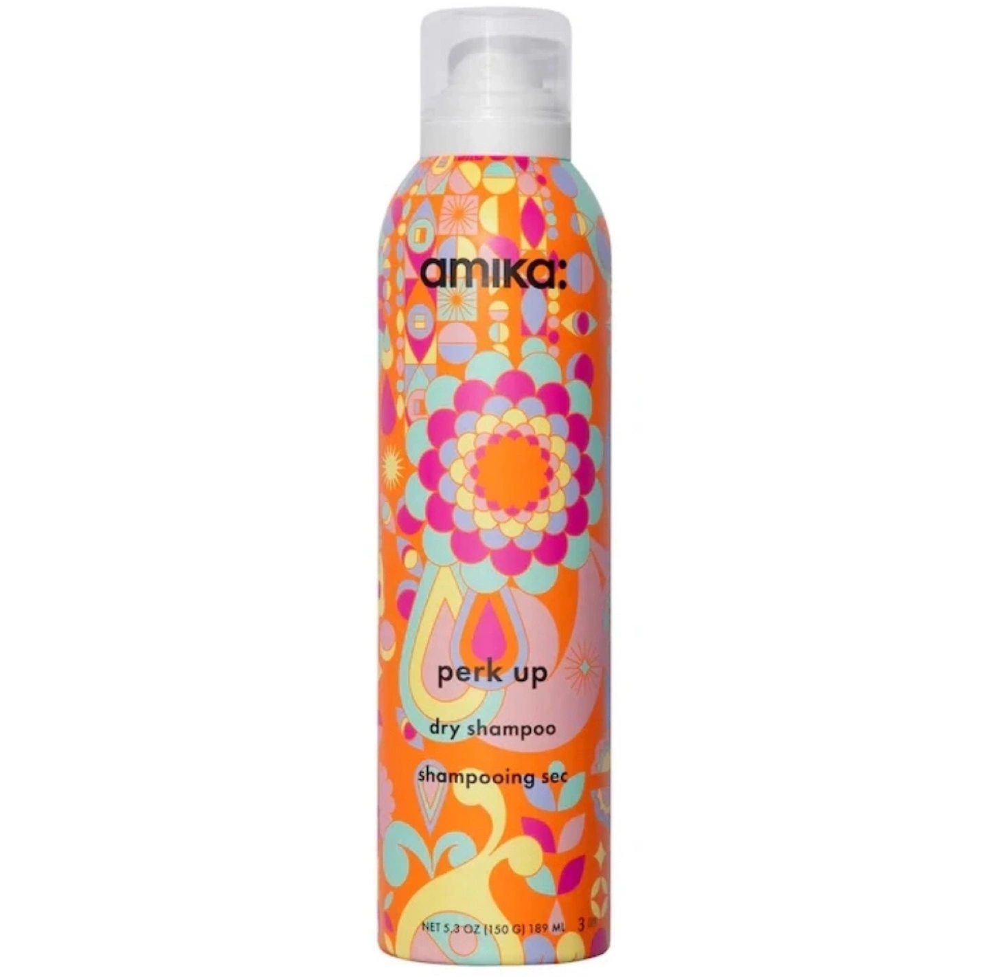 An orange-coloured canister with a white cap. Features a vibrant floral design with the text "perk up dry shampoo" on it. It's great to use when you need a quick refresh for your hair.