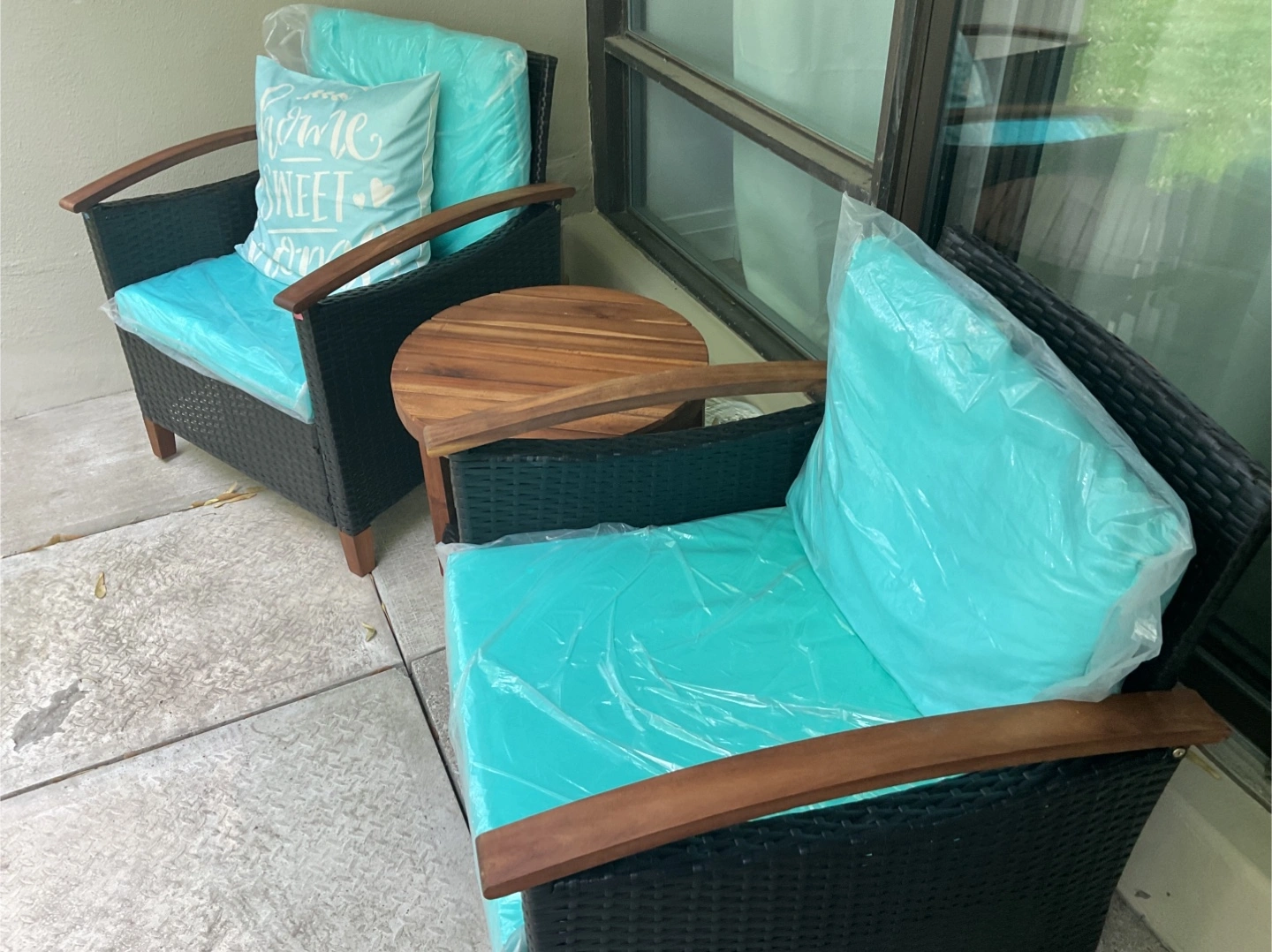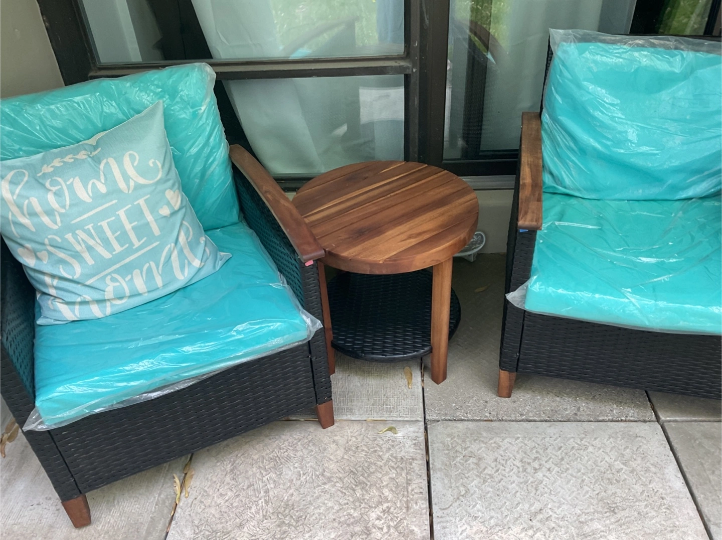 A patio set with two armchairs. Cushions in a vibrant blue, A round two tier table. The set has a modern look, perfect for relaxing outside with a good book.