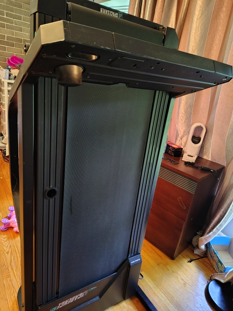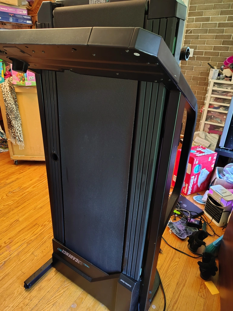 working Black treadmill with supportive arms and console. Features a running surface. Controls located on the console. Get some mindful exercise with this treadmill. downgrade needs gone. please have reliable transportation and helper to move it.