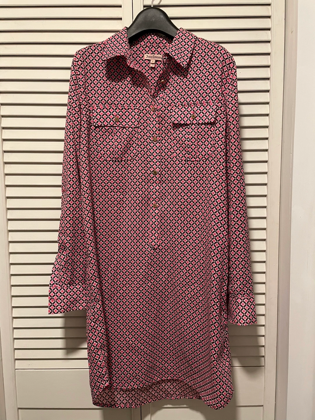 Patterned dress with long sleeves. It features a collared neckline and pockets on the chest. Button-up closure. You could wear this dress while enjoying a relaxing picnic.