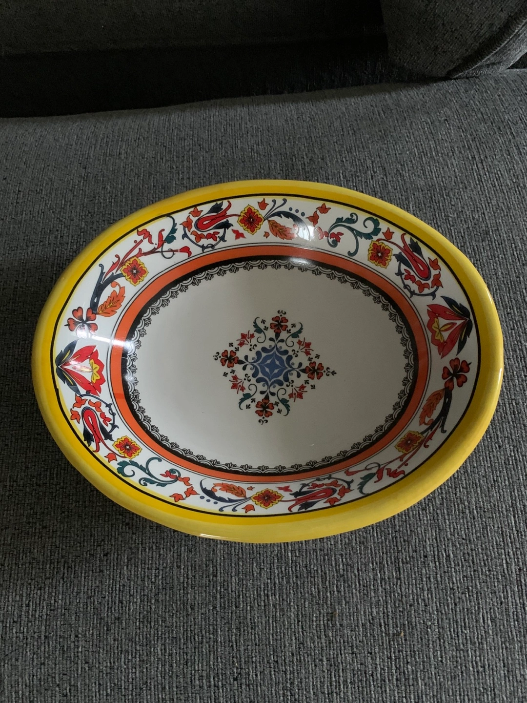 434An oval bowl with a floral design. It has a yellow rim and detailed patterns on the sides. -from Avon -serving bowl -new, not used