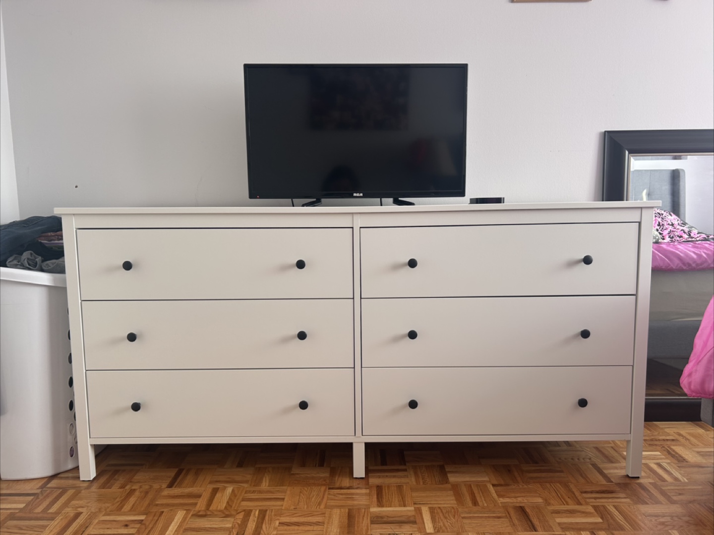 The dresser is white. It has six drawers with black knobs. Its a solid and versatile storage solution, ready for any space in your home. It's a beautiful addition to help organize your belongings and keep your space tidy.
