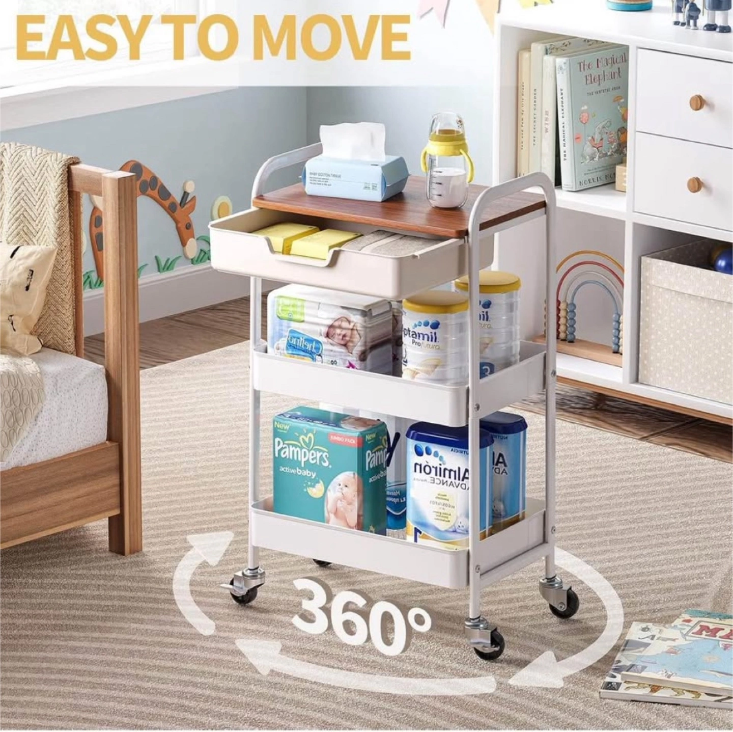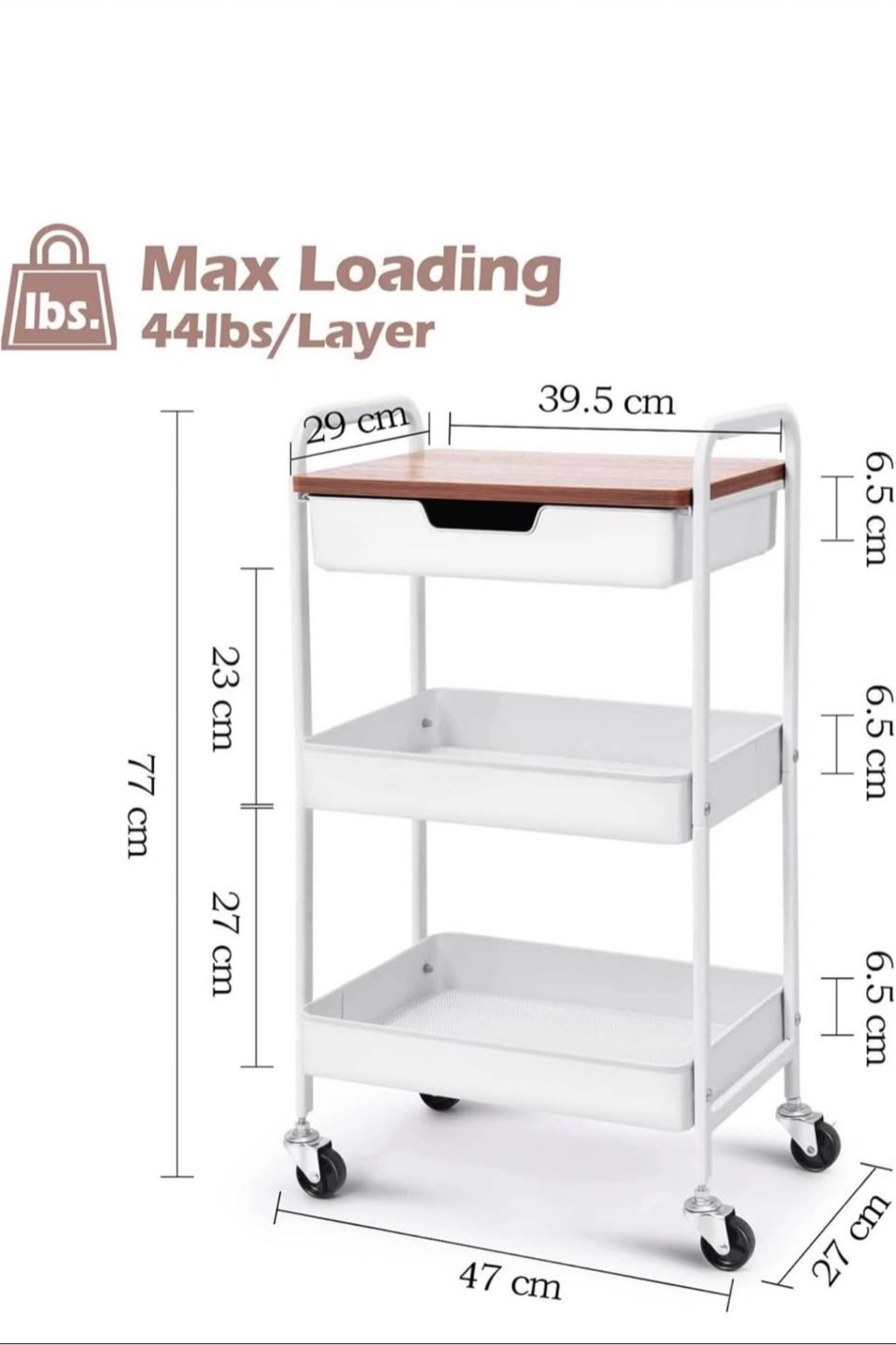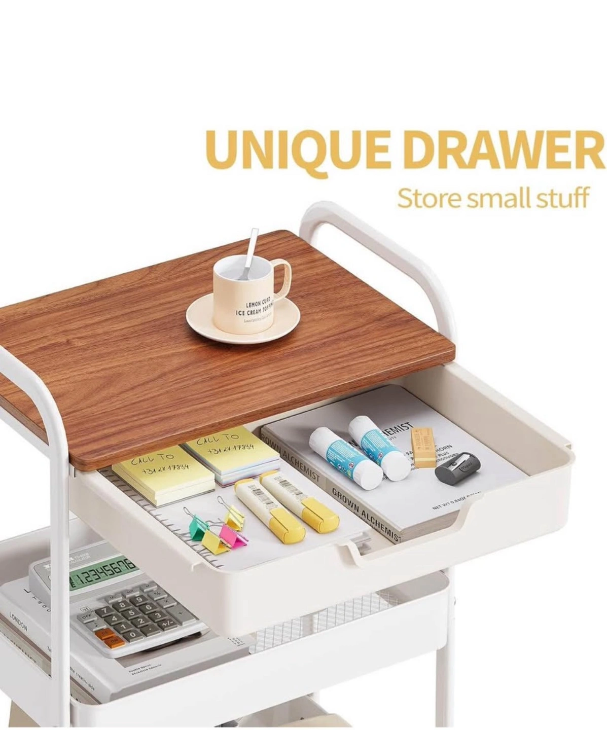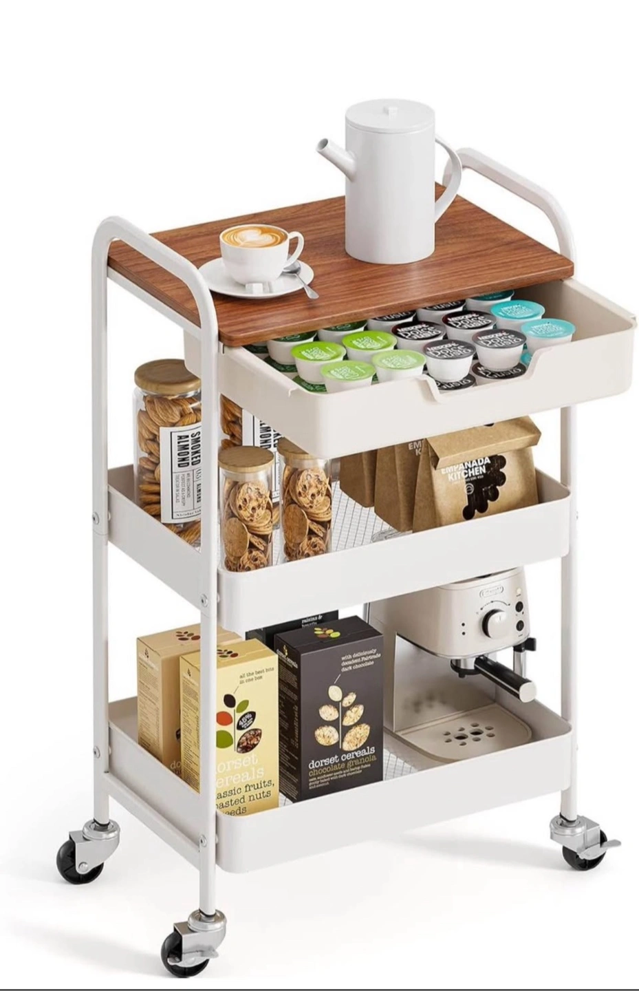 A three-tiered rolling cart. Includes a wood top and a drawer. White shelving with wheels for easy mobility. Perfect for storing snacks, drinks, and your favourite mug so you can create the perfect space for you to relax.