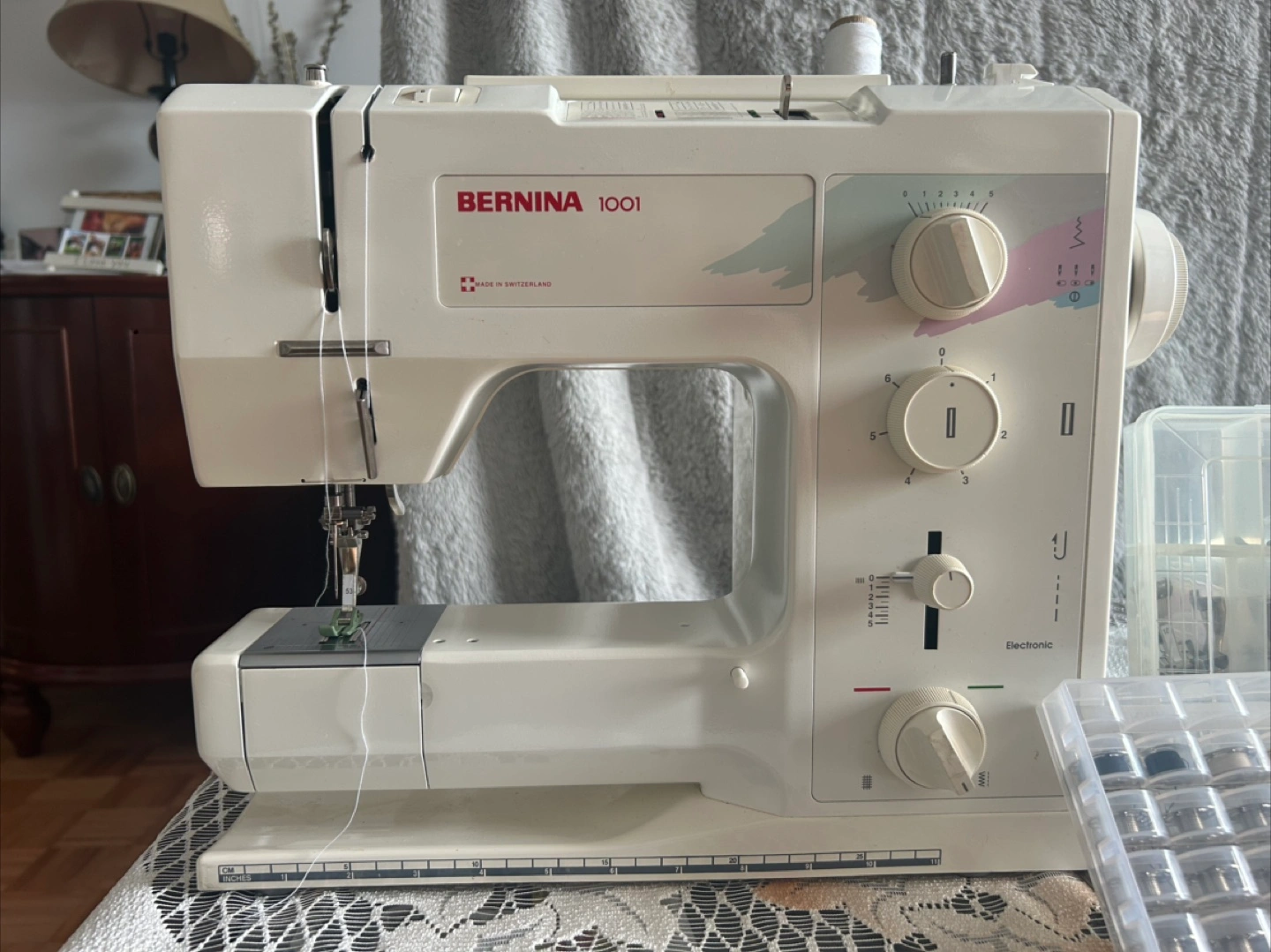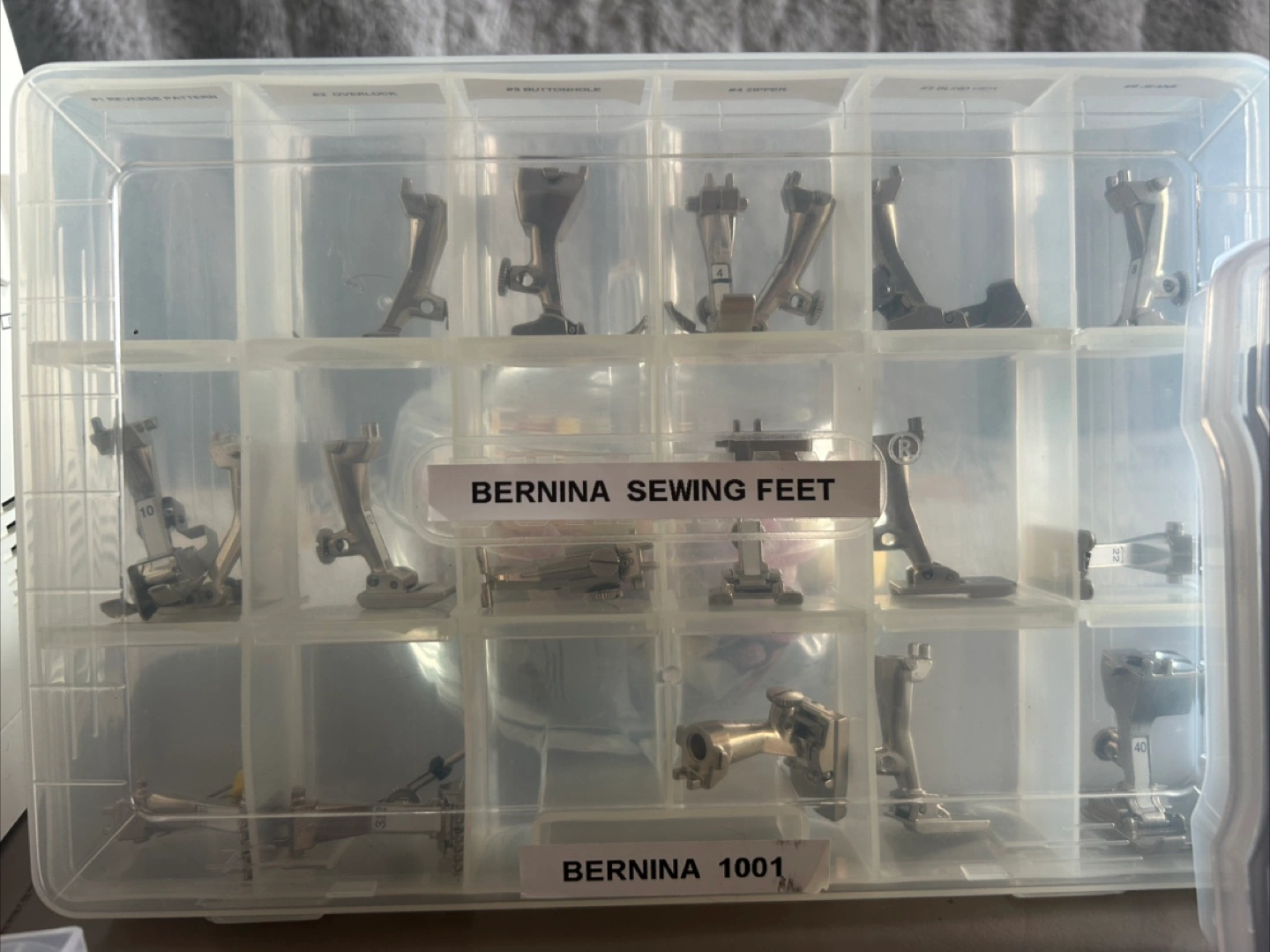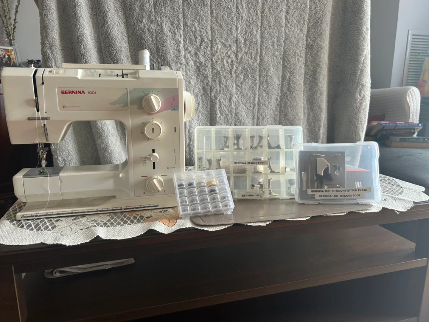 I am selling a sewing machine, along with many accessories. Sewing machine is white. Accessories include sewing feet, bobbins, and more. The machine has several knobs. It's a great item to inspire creativity, just imagine all the projects you could do.
