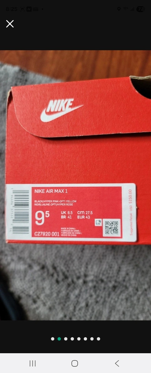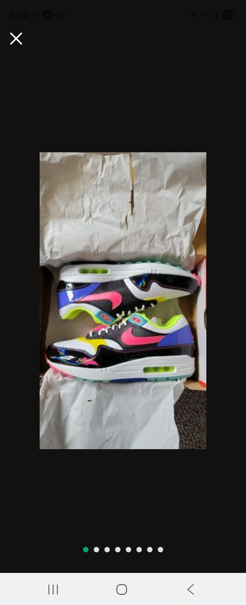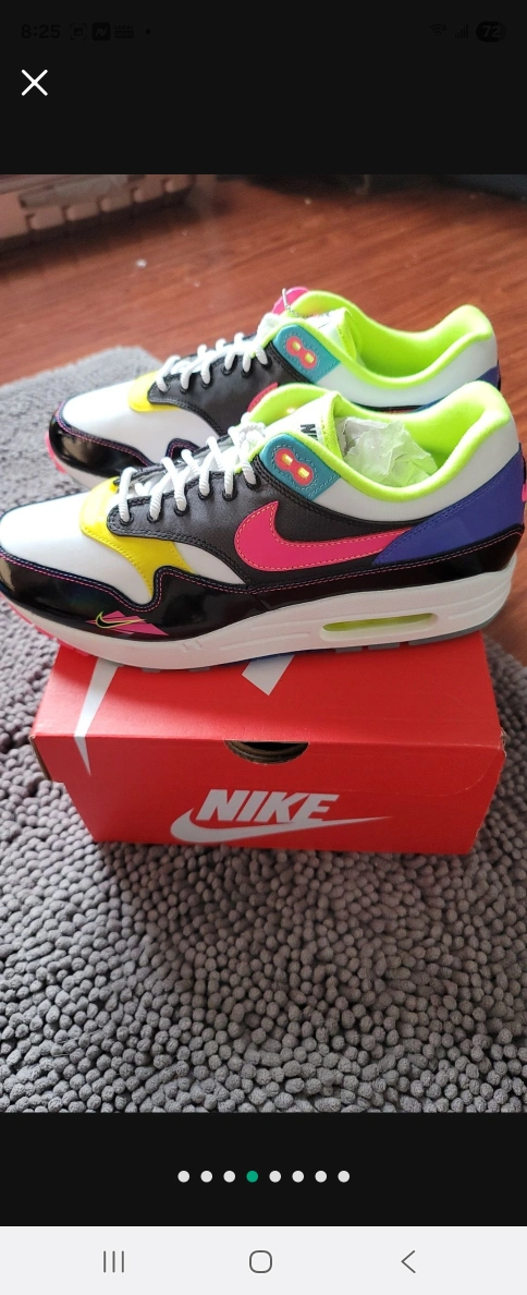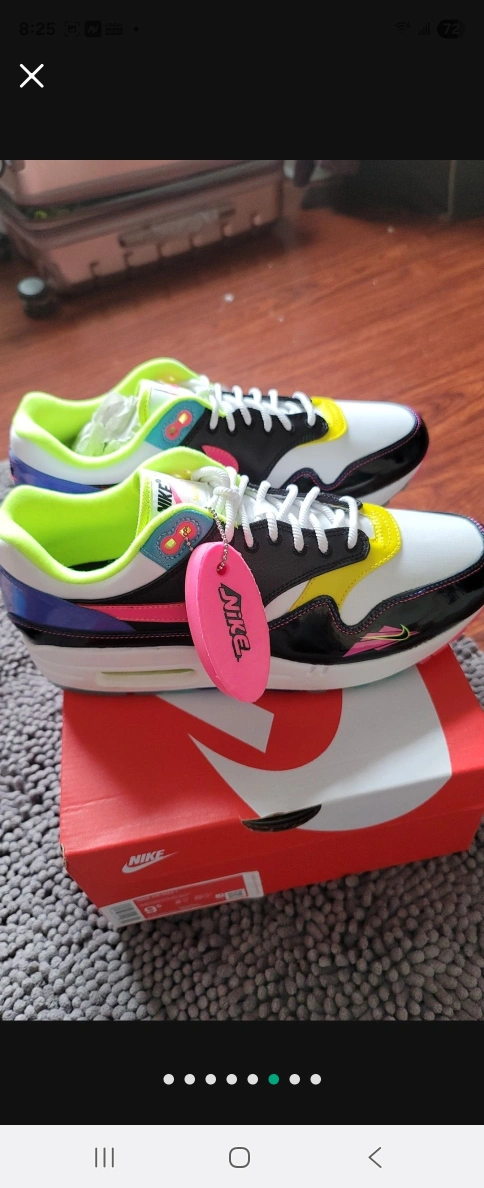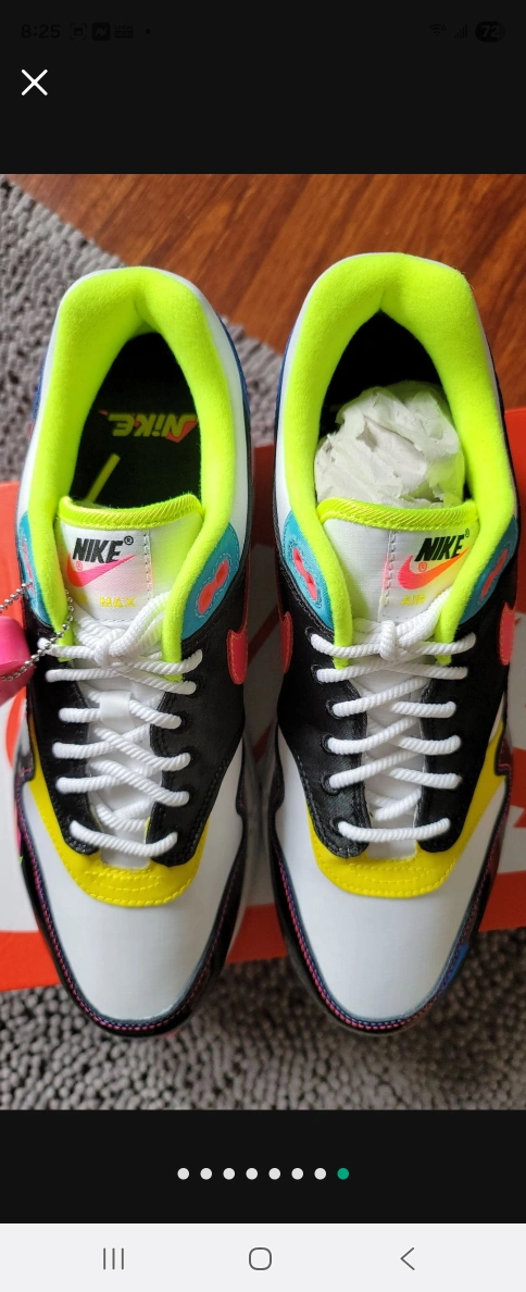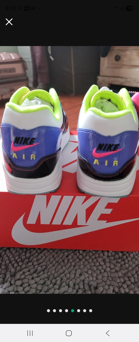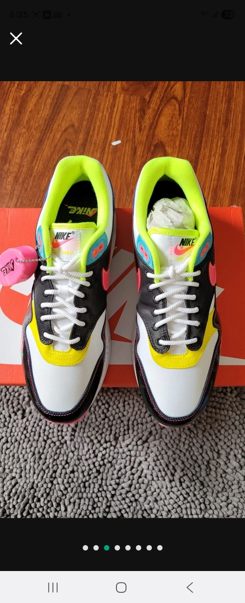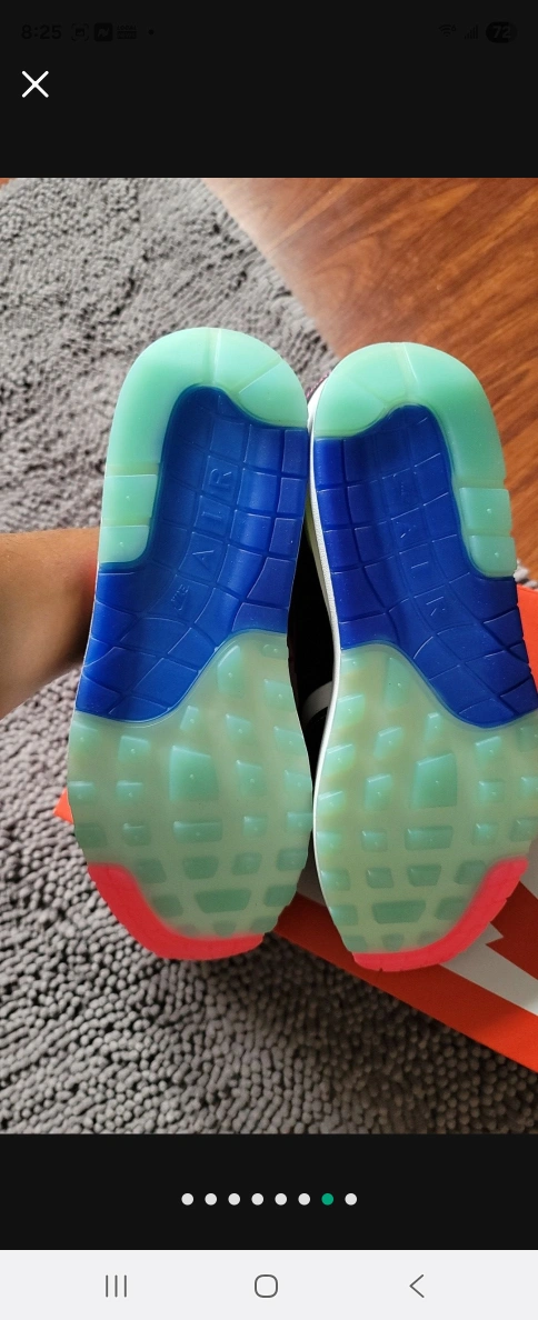 Eye-catching sneakers with colorful accents. White laces going up the tongue. The back of the shoe has the Nike Air logo. These would be great for a peaceful walk on a sunny day.