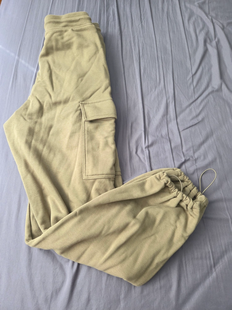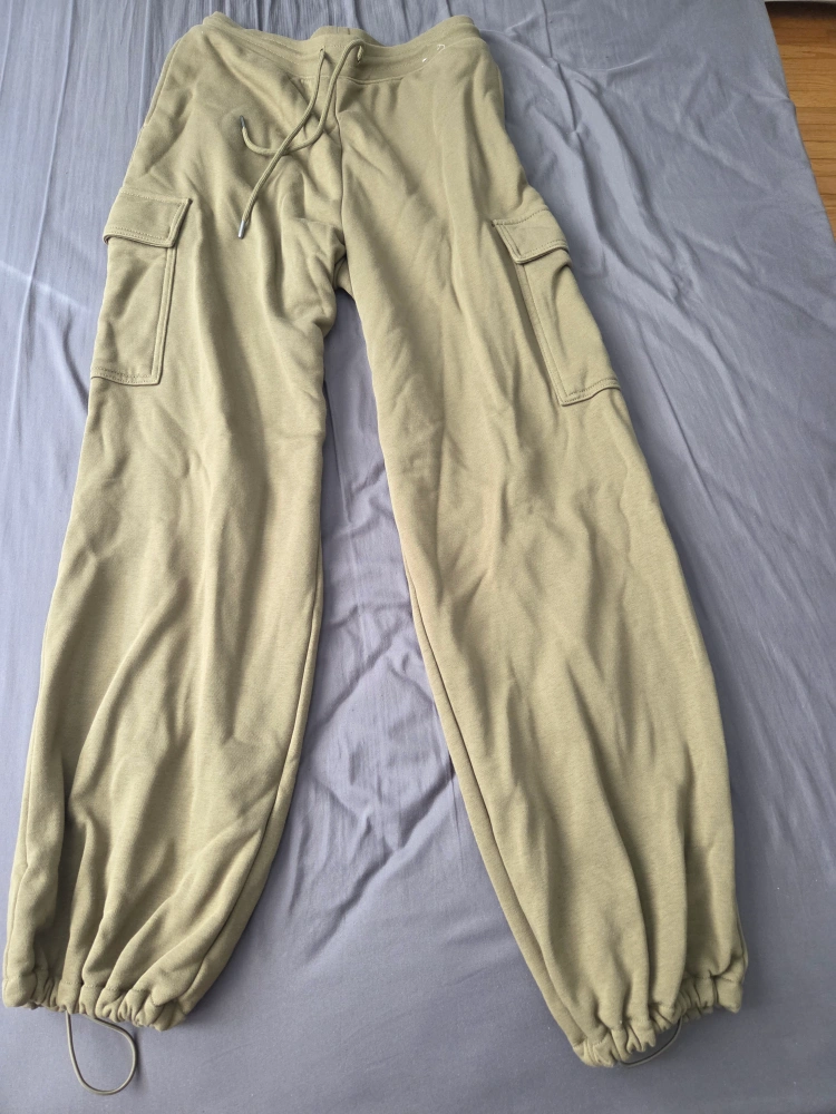 Comfortable sweatpants with a drawstring waist. Features cargo pockets on the sides.