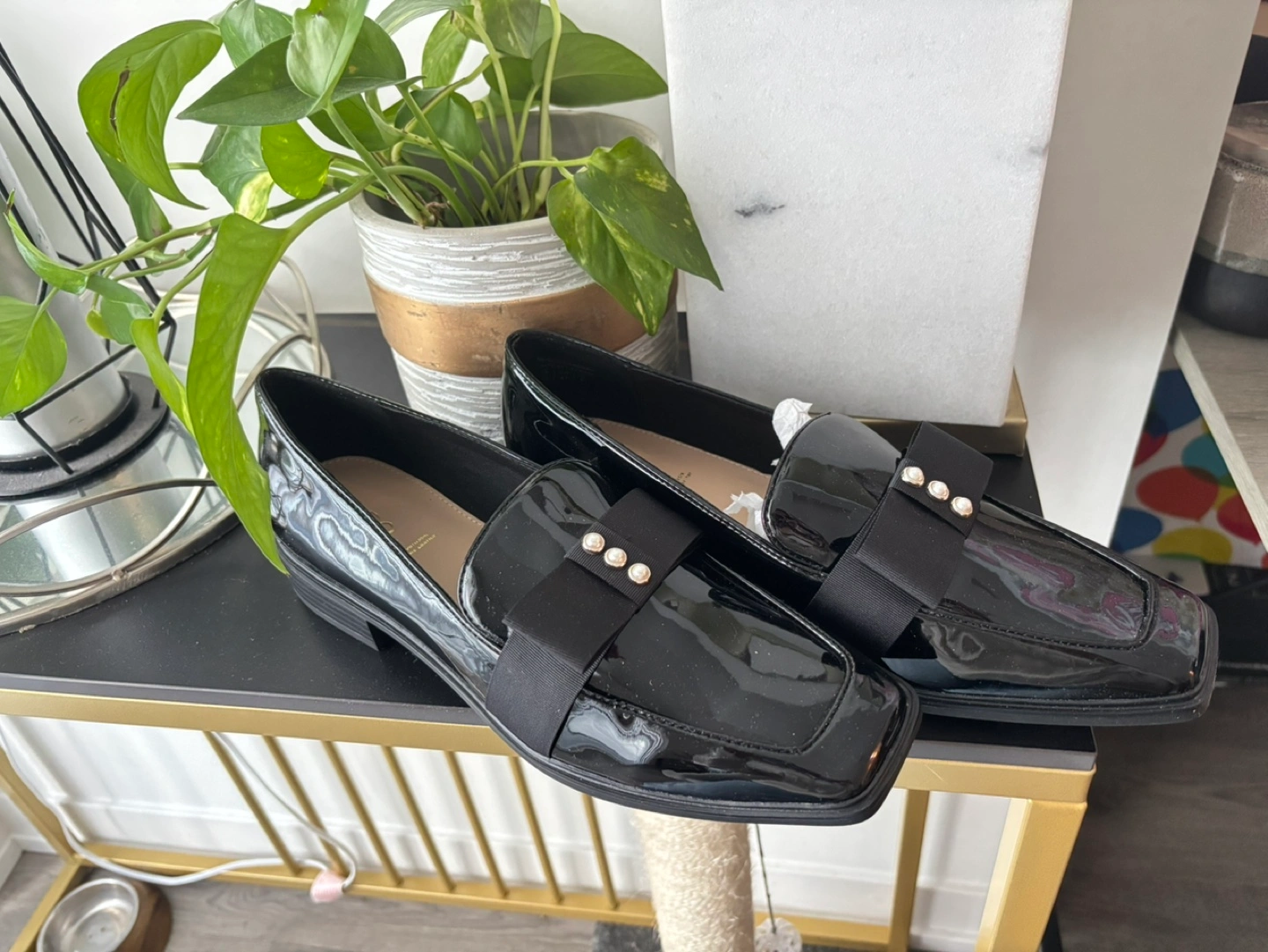 A pair of black patent leather loafers. They have a square toe and a decorative black bow detail with small pearls. Perfect for stepping out in style. Brand new, bought them to wear on an event, but it never happened.