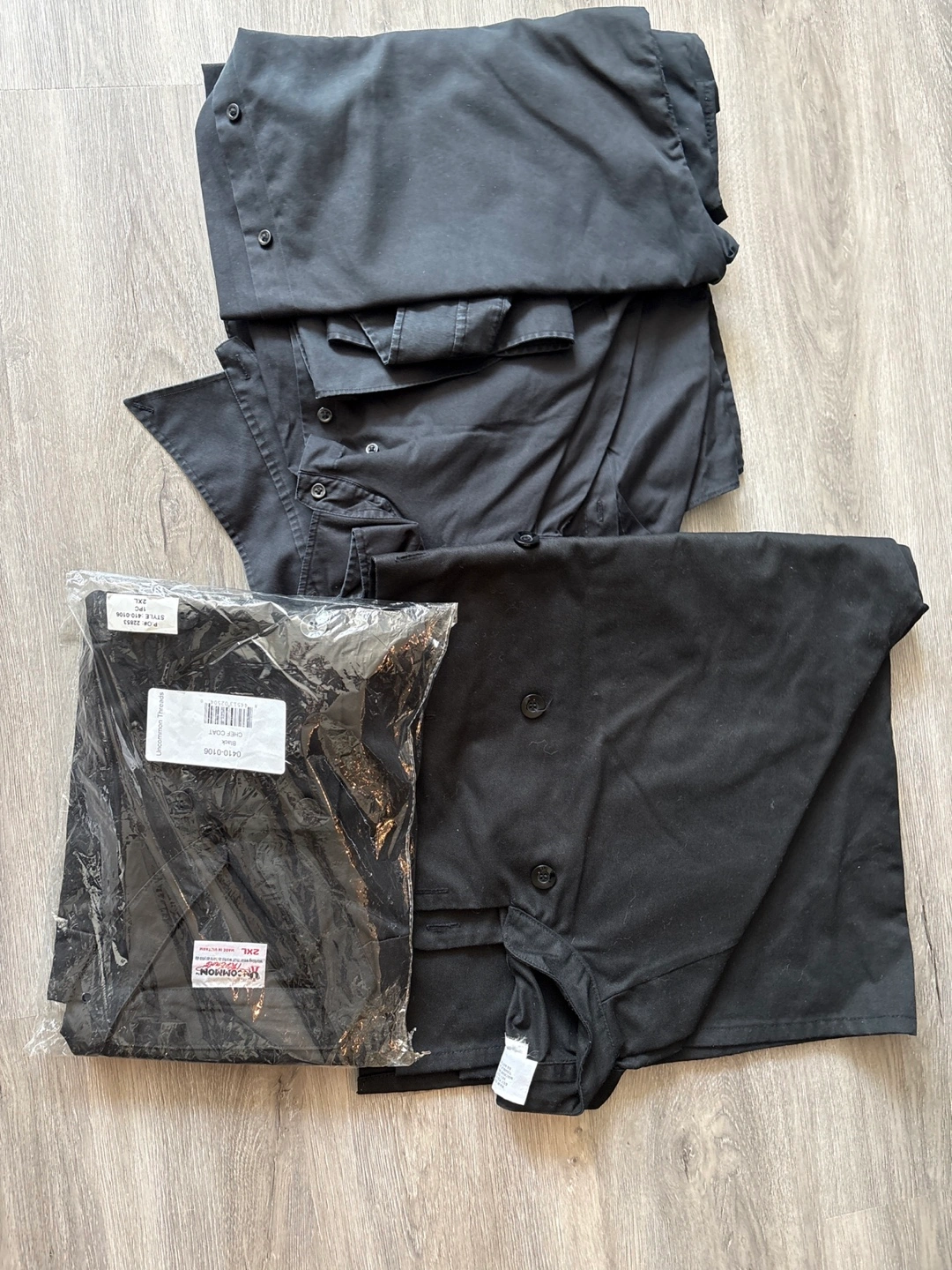 A collection of black chef coats. Several folded, others are still new in packaging. These coats are perfect for anyone in the culinary arts.