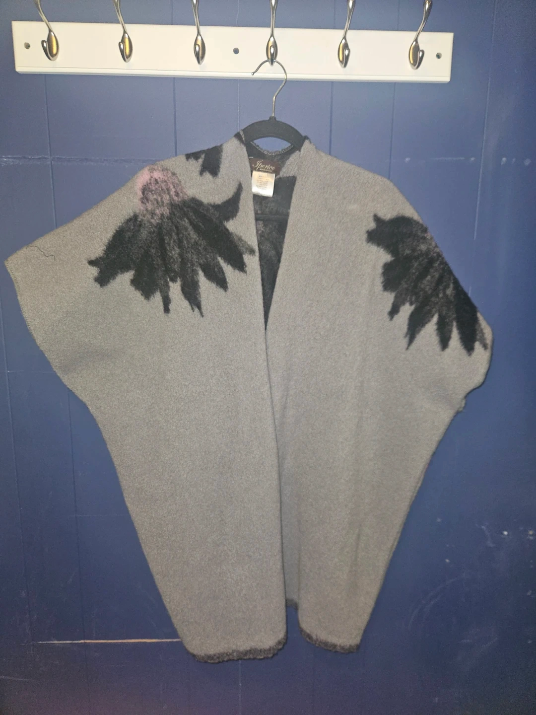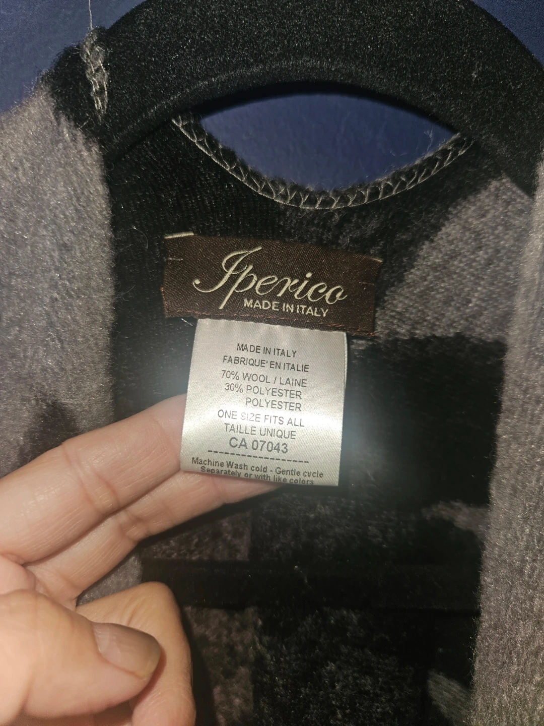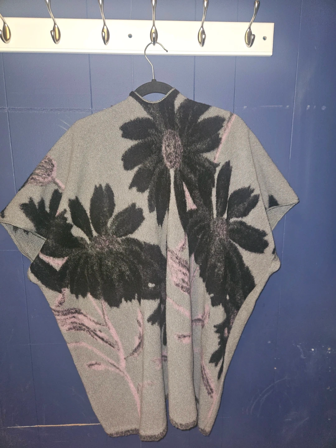 This Iperico poncho is made in Italy. It's one size fits all and features a floral design. The material is 70% wool and 30% polyester.