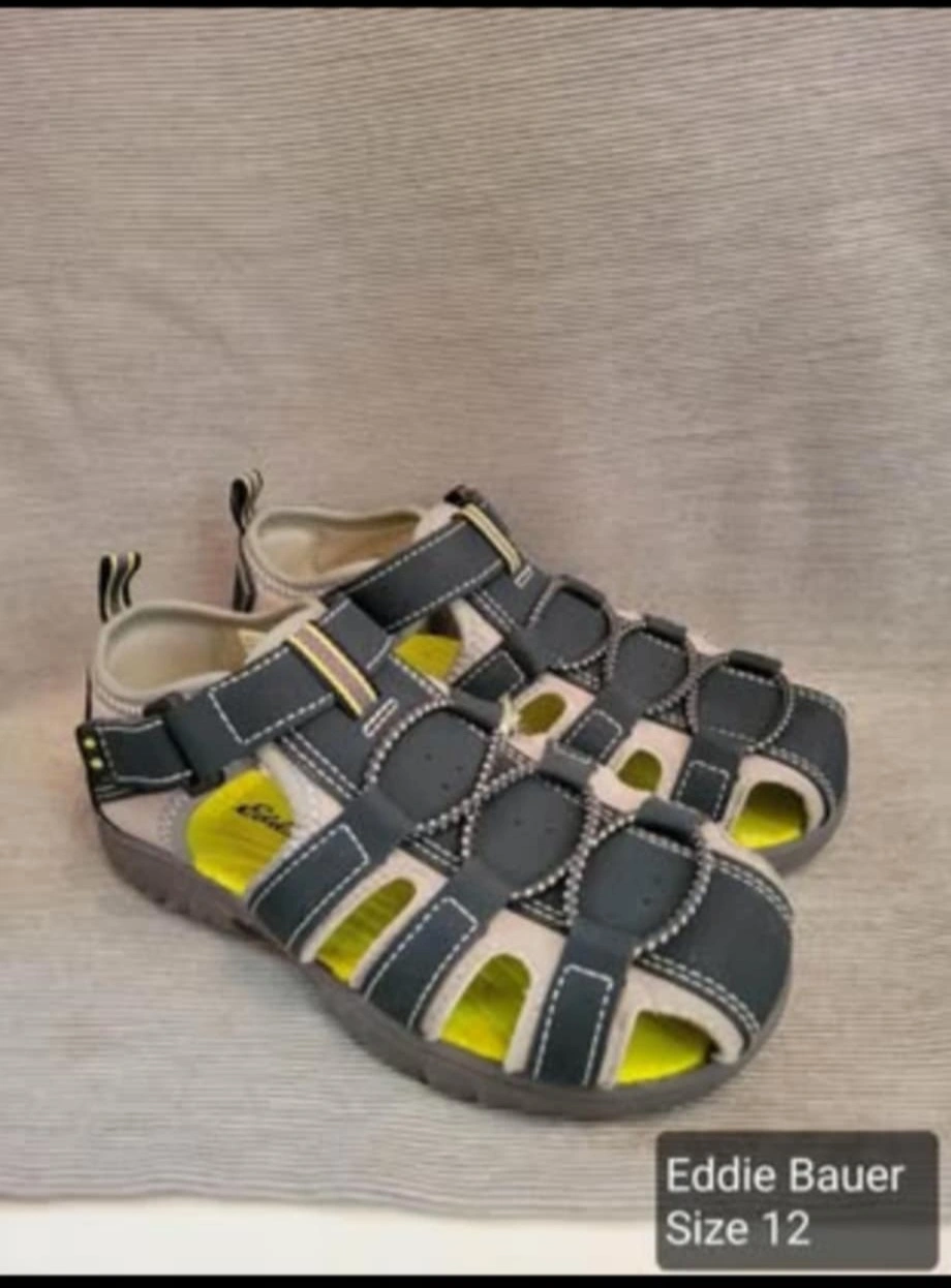 Sandals with blue and grey details. Open design with a yellow inner sole. Perfect for any adventure, allowing you to connect with nature and the world around you. Worn once