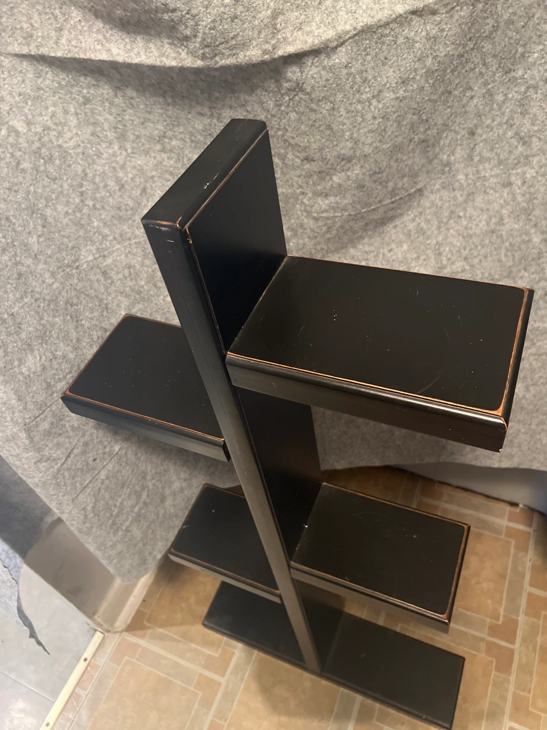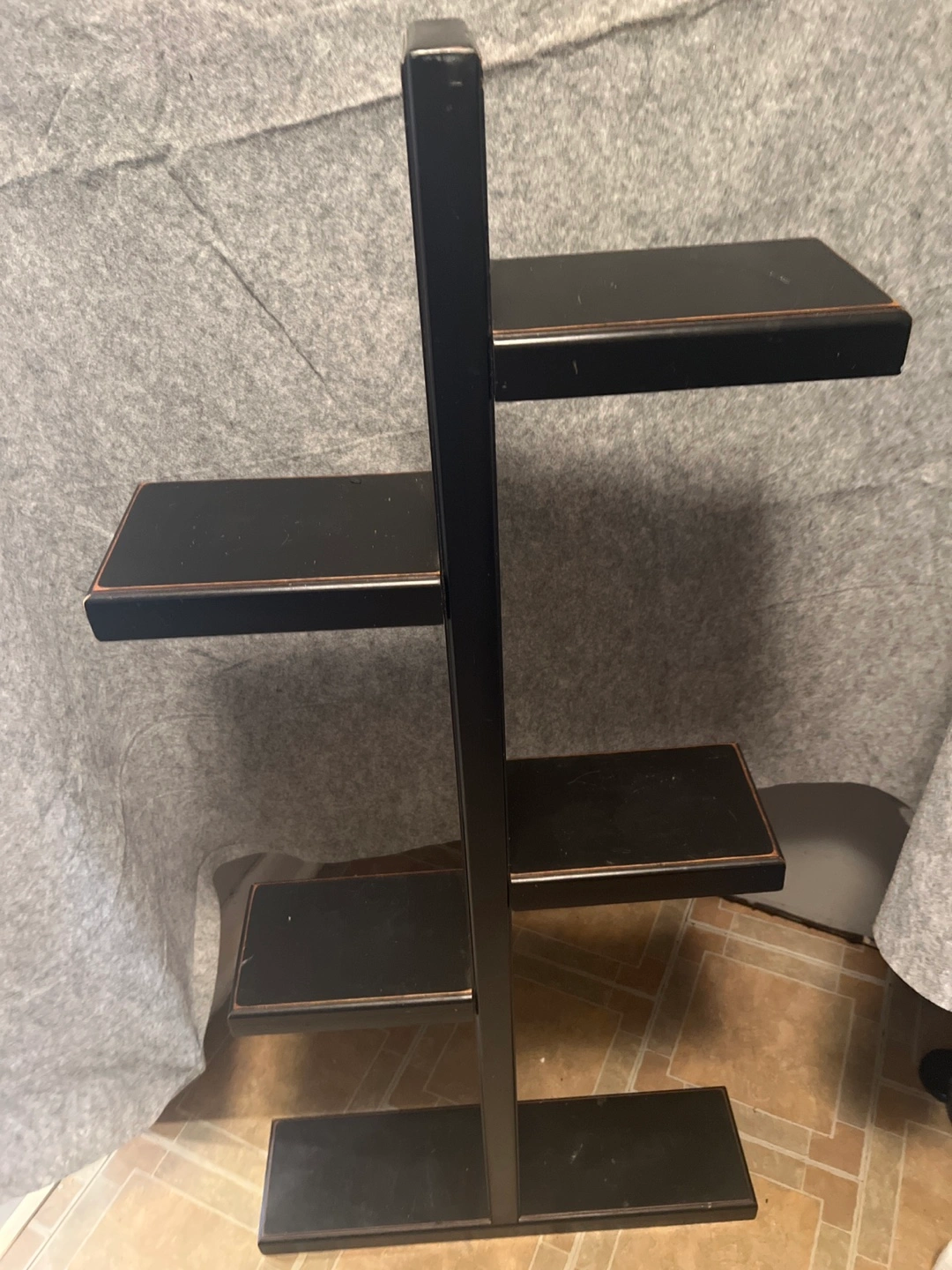 1000+A black, tiered shelf. The shelves are square in shape. The frame is a straight line. A good place to put your plants or some treasured objects, to look at as you unwind after a long day.