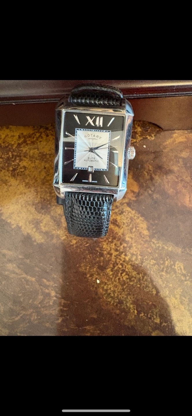 Automatic watch in a rectangular shape. Features a black leather strap. Rectangular watch face with visible mechanism. It can be a great conversation starter in any setting.