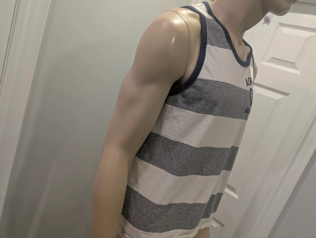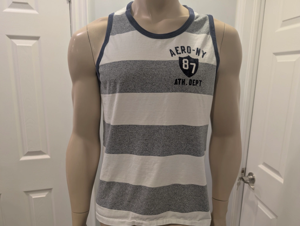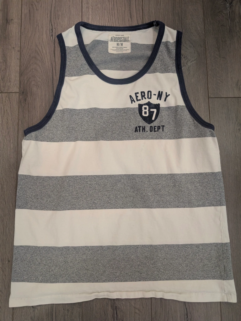 Good used condition. This Aeropostale tank top features a stylish grey and white striped pattern, perfect for summer casual wear.