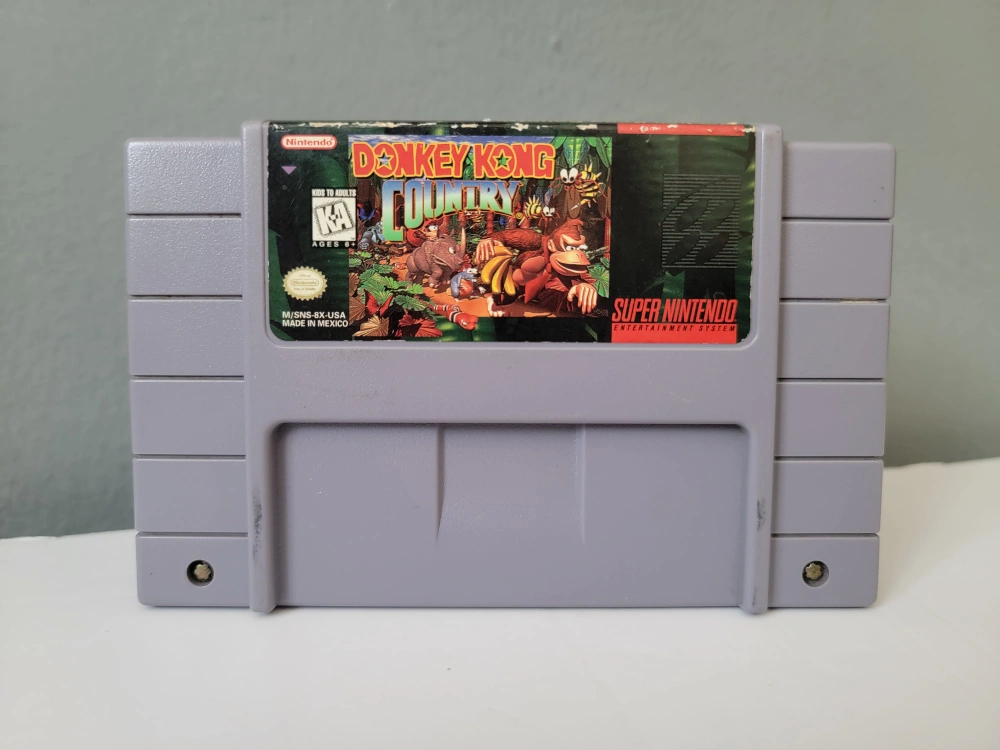 A classic Super Nintendo cartridge. Shows Donkey Kong Country game art. There is some shelf wear visible. This game is perfect for a cozy evening in.
