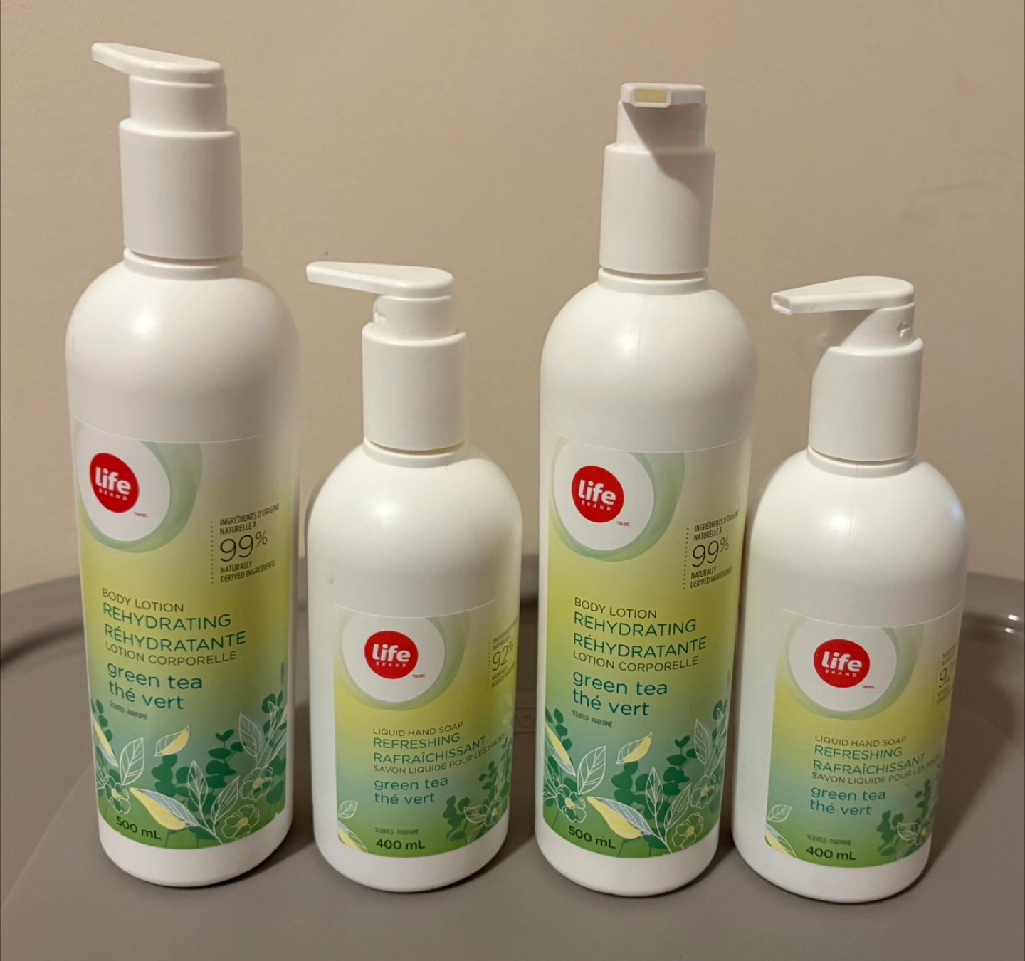 Green tea scented body lotion and liquid hand soap. There are two bottles of each for your enjoyment.